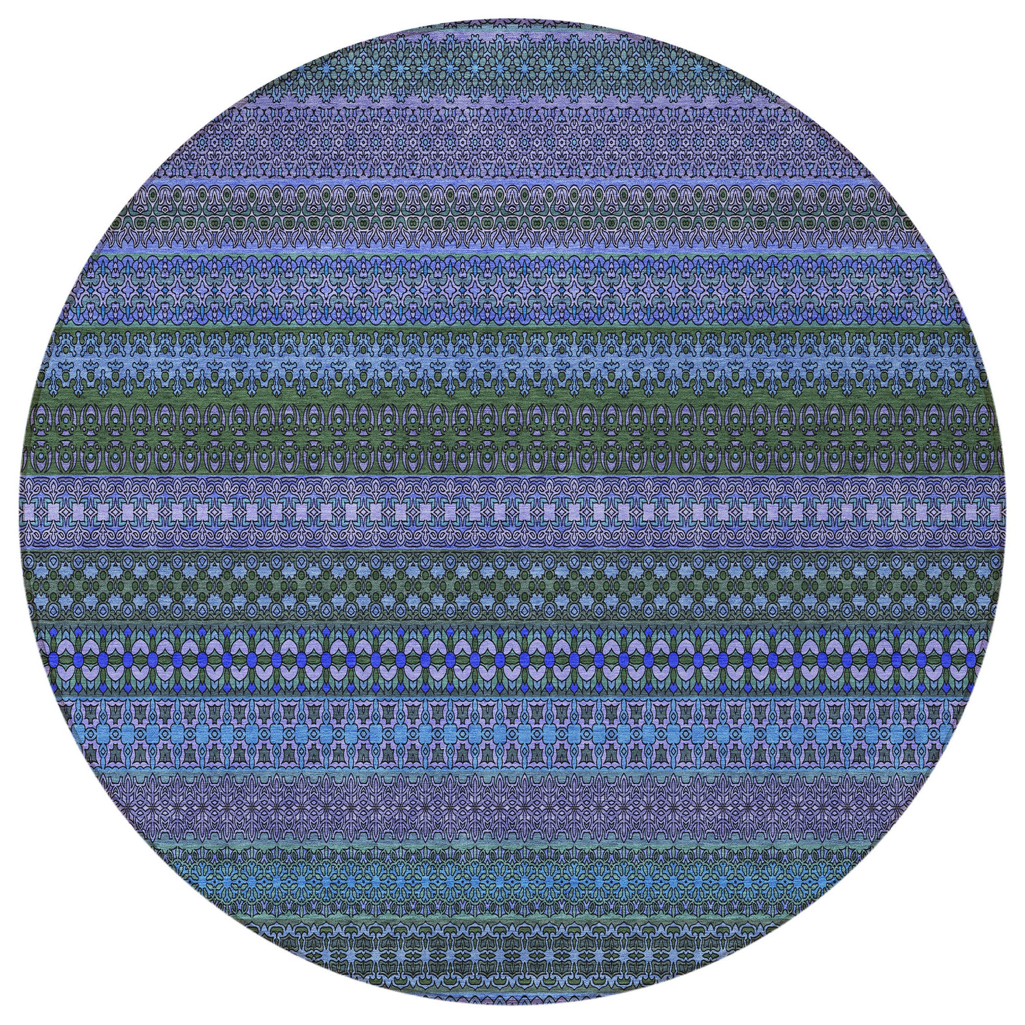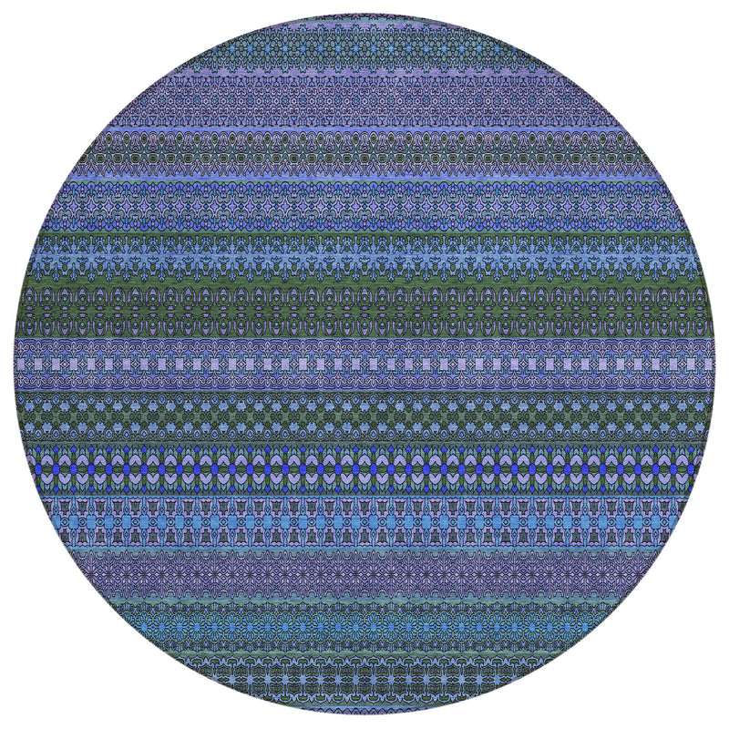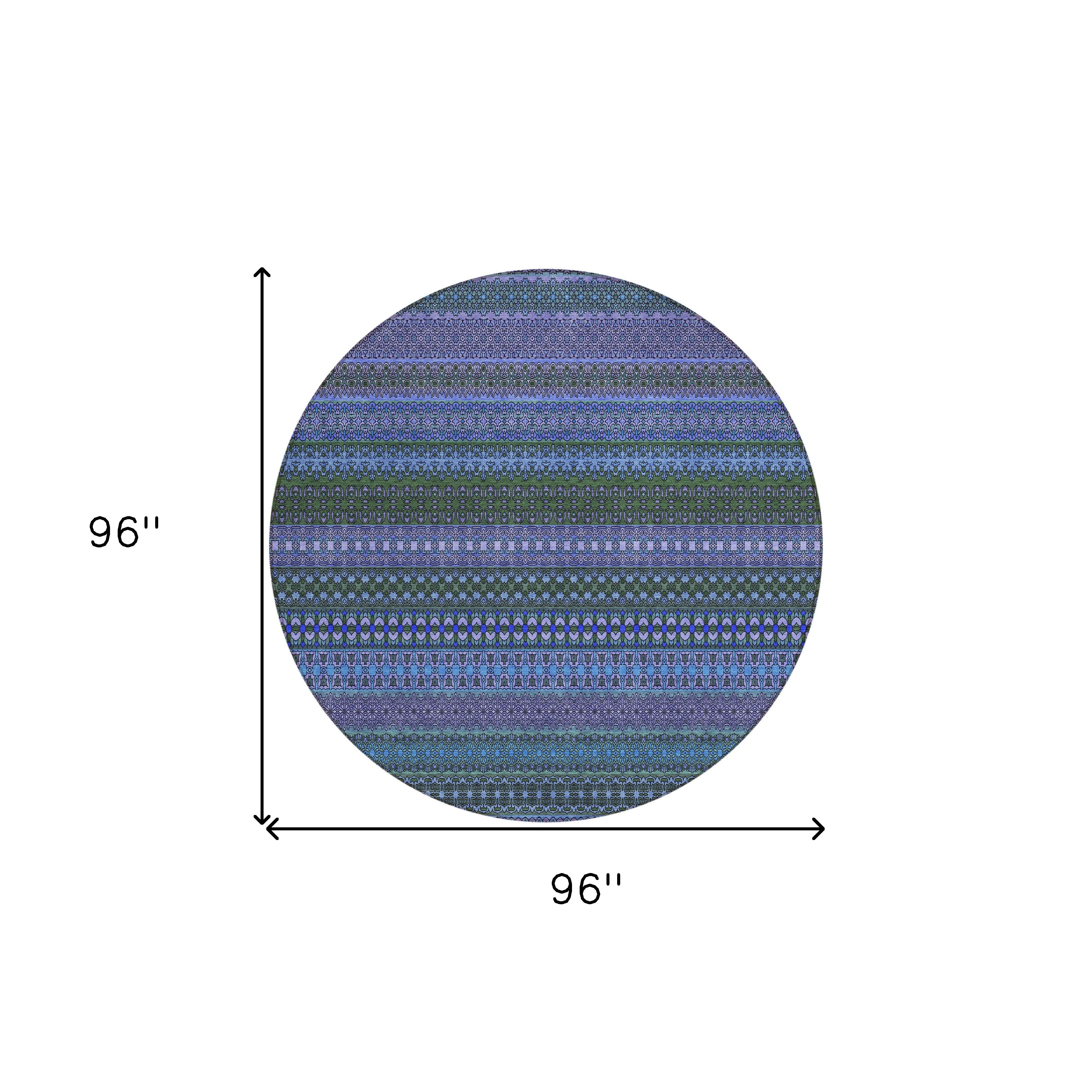 8' Round Blue and Green Round Striped Washable Non Skid Indoor Outdoor Area Rug