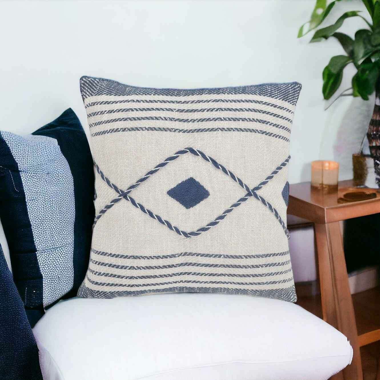 The perfect complement to your sofa, favorite chair, or bed, this 20" x 20" blue and white 100% cotton coastal zippered pillow is a great decorative accent. This blue and white colored decorative pillow is made from high grade 100% cotton that makes it super soft to the touch and long lasting. Decorative throw pillows not only add color and dimension to your space but can be comfy and supportive when you are lounging and cuddling as well. A great decorative accessory for your favorite chair, to accent your sofa, or to use as part of your bed ensemble. 4" H x 20" W x 20" D