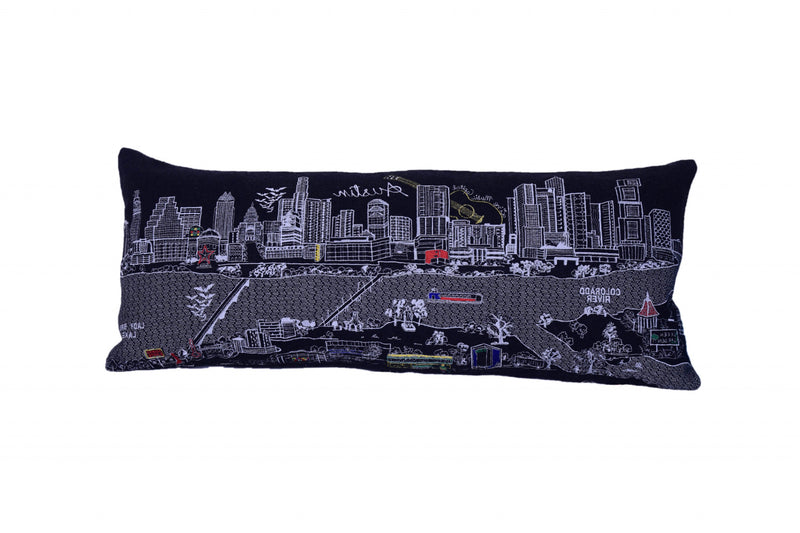 Showcase this famous city, with our Black Color Austin Nighttime Skyline Queen Size Lumbar Decorative Pillow. The Nighttime view of Austin that includes the Colorado River and Lady Bird Lake, is picture perfect. The gorgeous art features many famous landmarks and references for this destination city, rendering a modern whimsical way to bring this iconic cityscape to life. Made of a wool/nylon blend, this high quality stitched decorative pillow features white on black embroidered artwork mixed with pops of color that highlight important and recognizable icons from this popular and bustling Texas city. This pillow makes a great gift, decorative accent and conversation piece. 4" x 35" x 14"