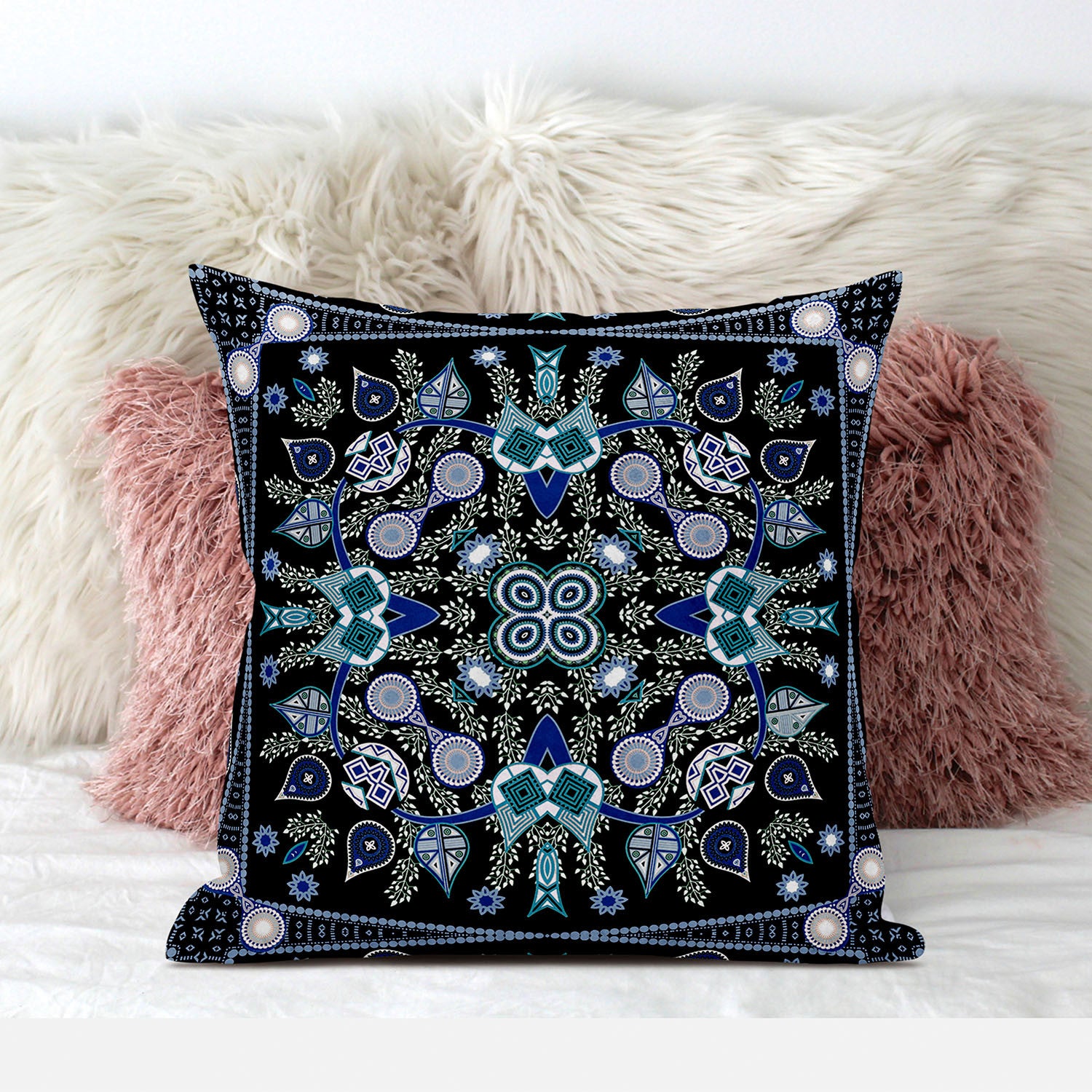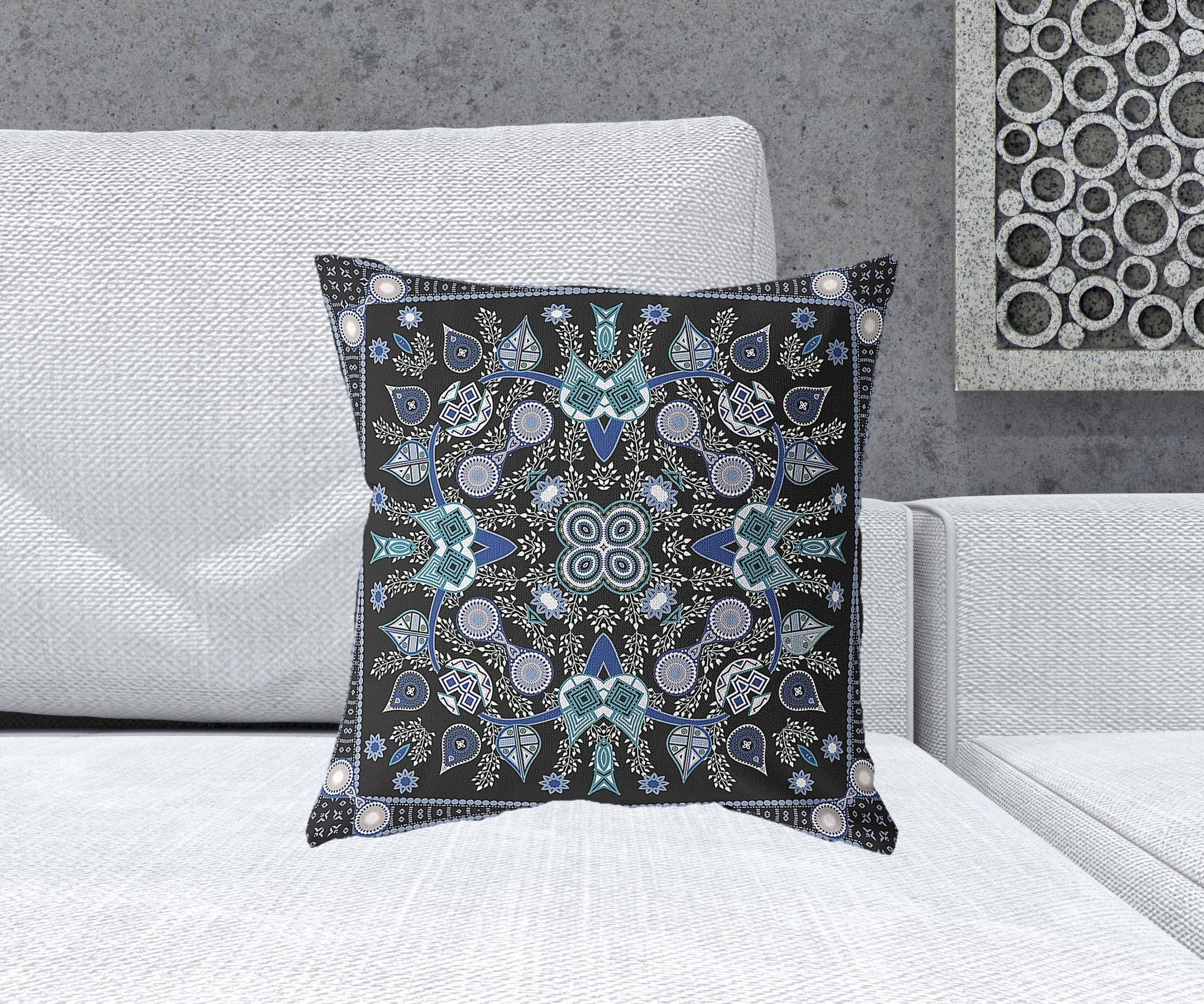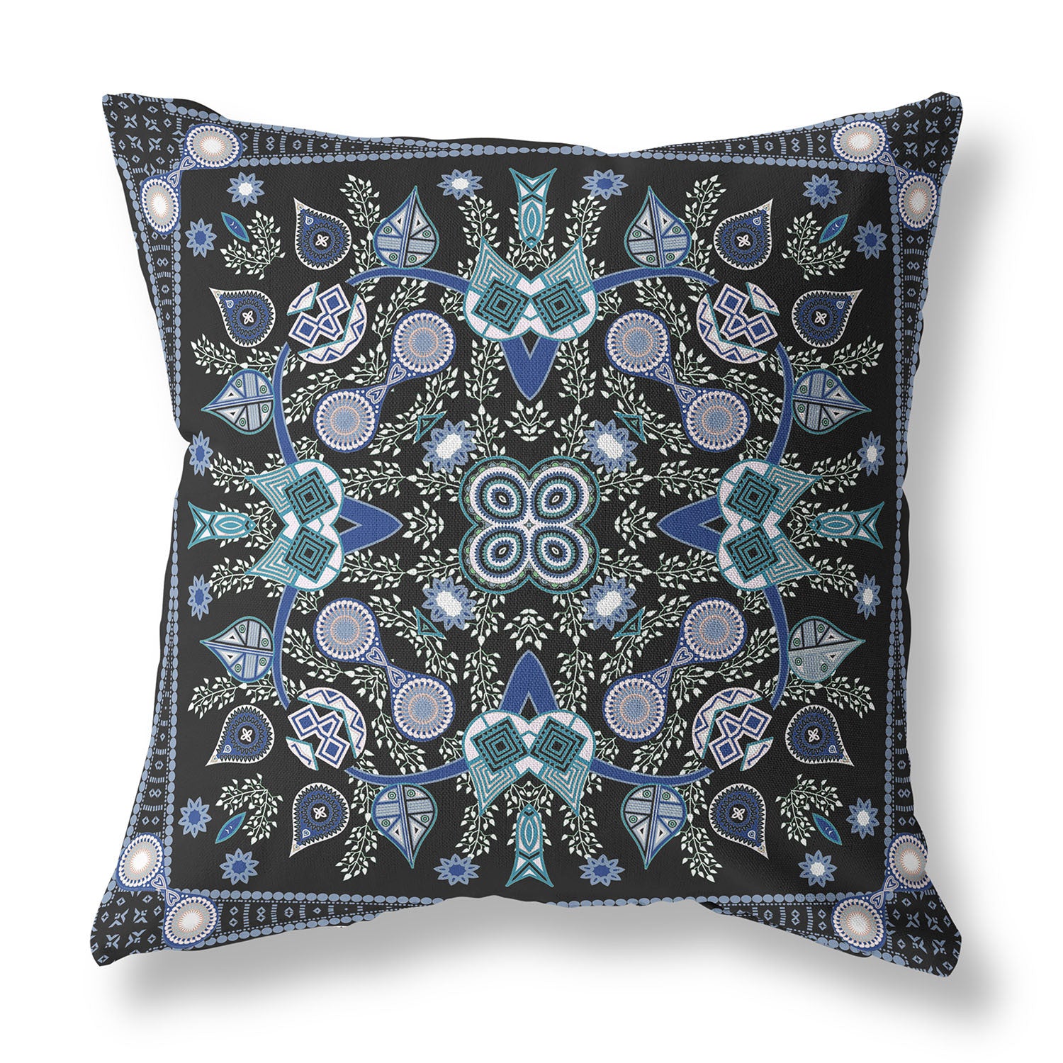 18" X 18" Black And Blue Blown Seam Floral Indoor Outdoor Throw Pillow