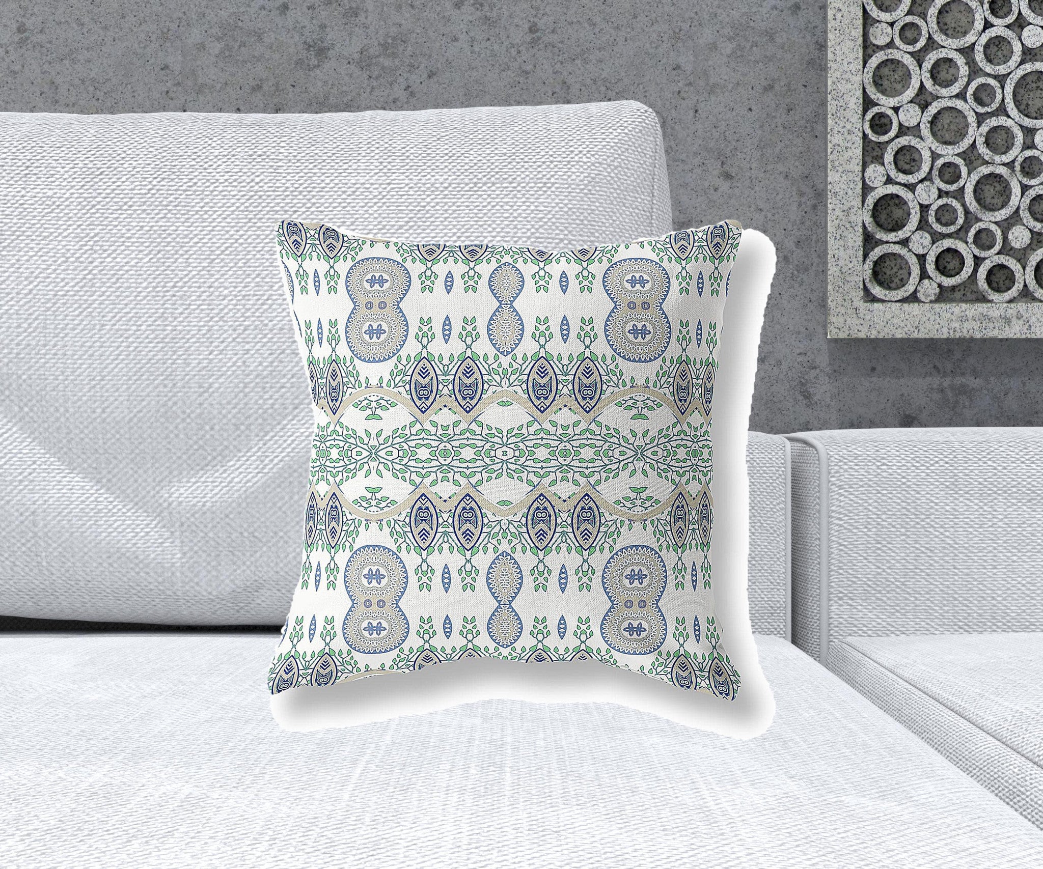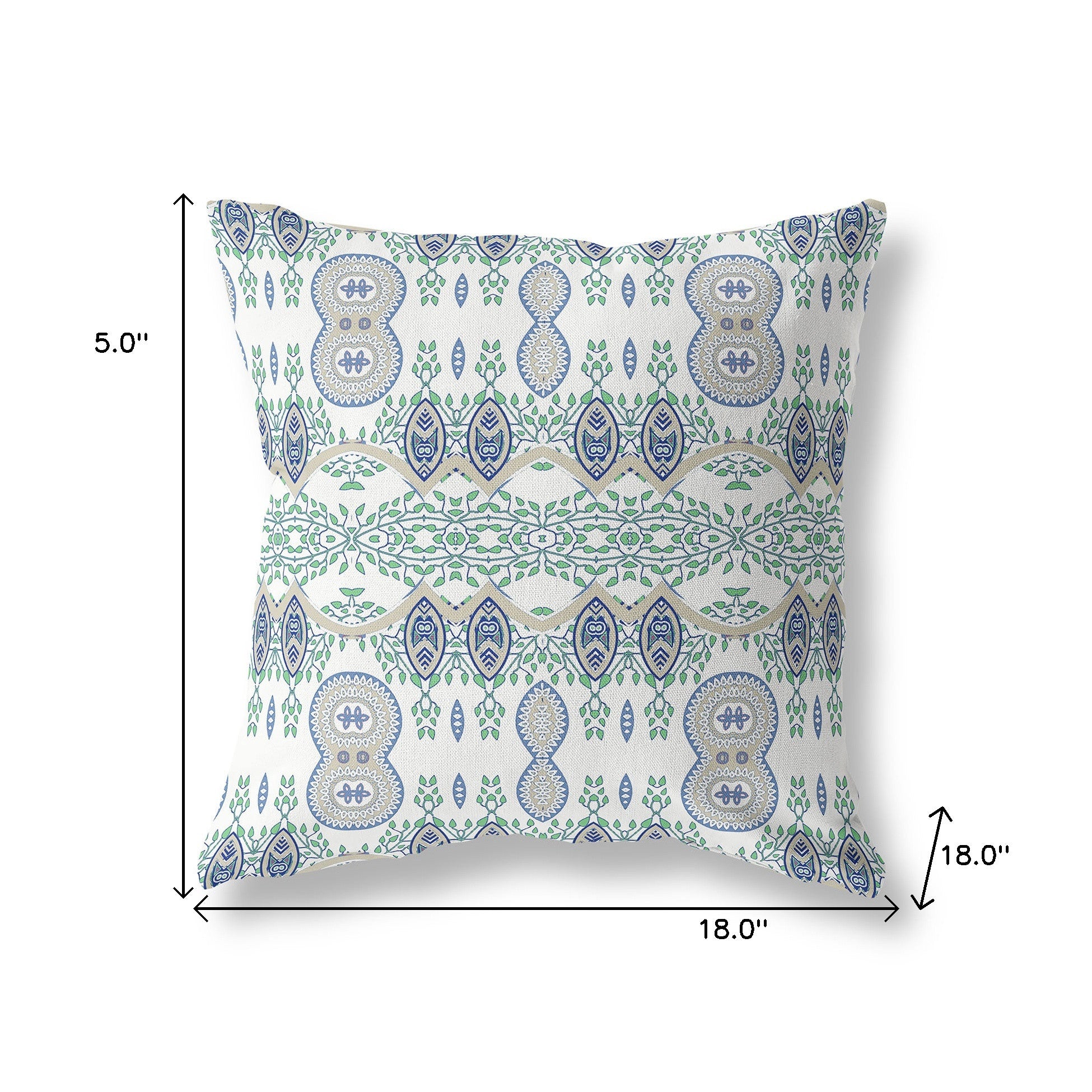The perfect complement to your sofa, favorite chair, or bed, this 18" x 18" off white and beige blown seam paisley indoor outdoor throw pillow is a great decorative accent. Durable off white and beige broadcloth has been used to give this pillow a beautiful look that will stand the test of time. A great decorative accessory to decorate indoors or out. Great to use on its own or mix with other decorations for the perfect look. 5" H x 18" W x 18" D