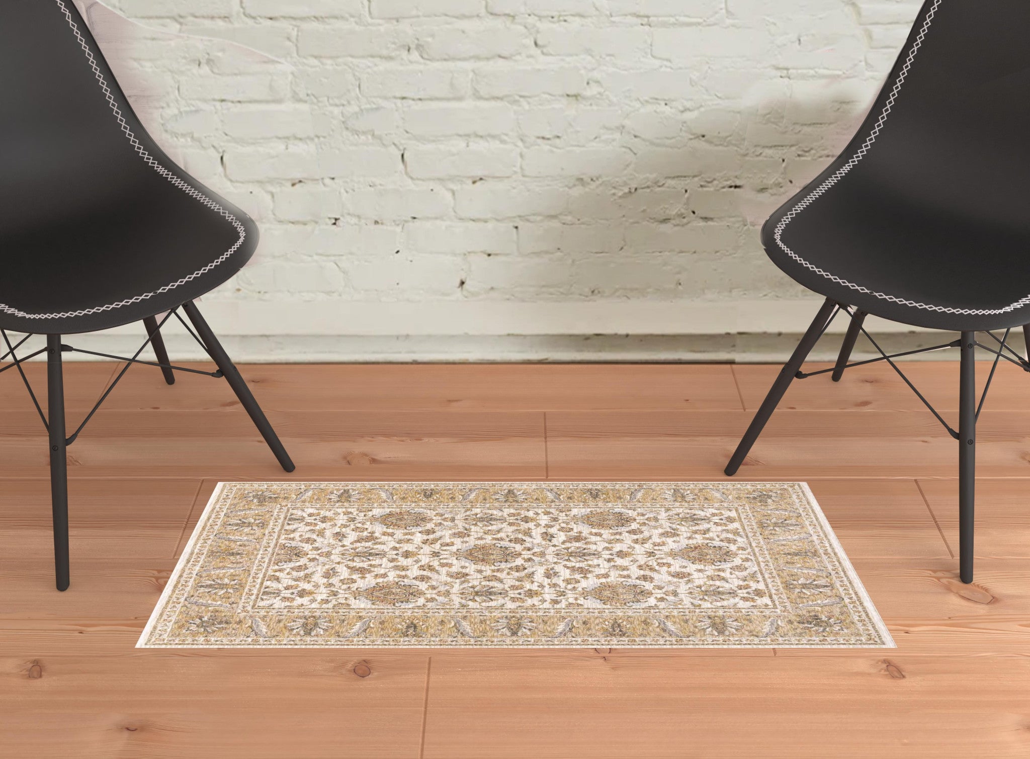 2' X 3' Ivory And Gold Oriental Power Loom Stain Resistant Area Rug With Fringe