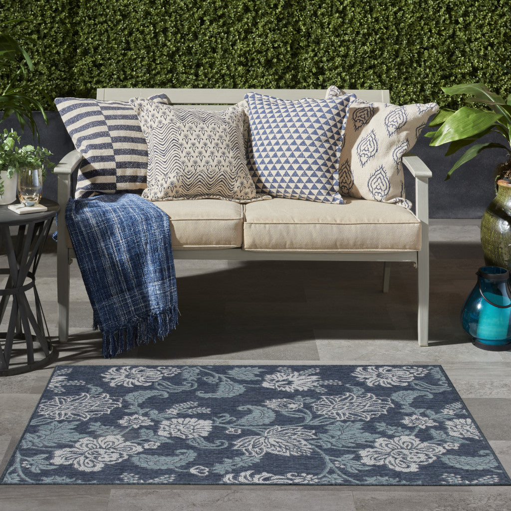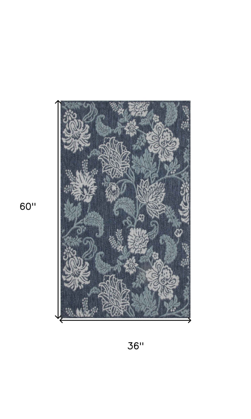 3' X 5' Navy Blue And Ivory Floral Indoor Outdoor Area Rug