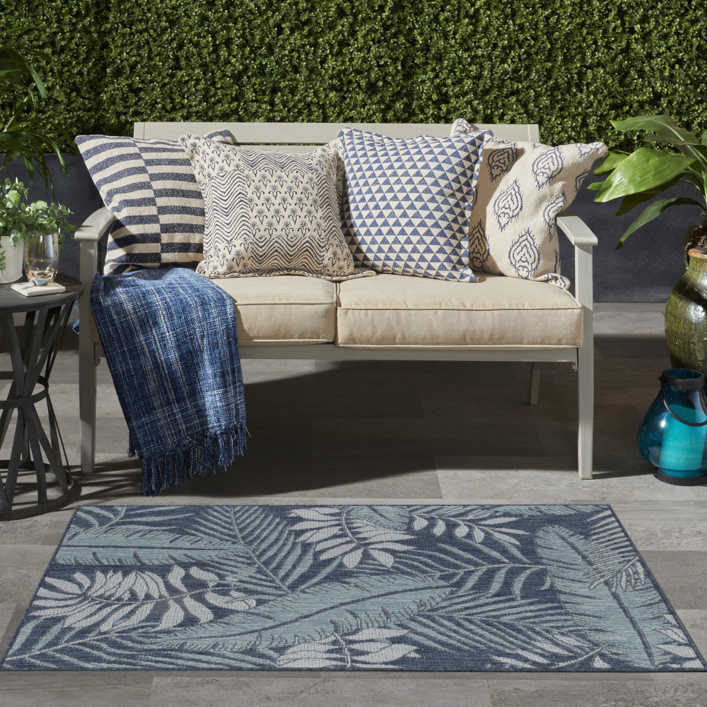 3' X 5' Navy Blue And Ivory Palm Leaf Indoor Outdoor Area Rug
