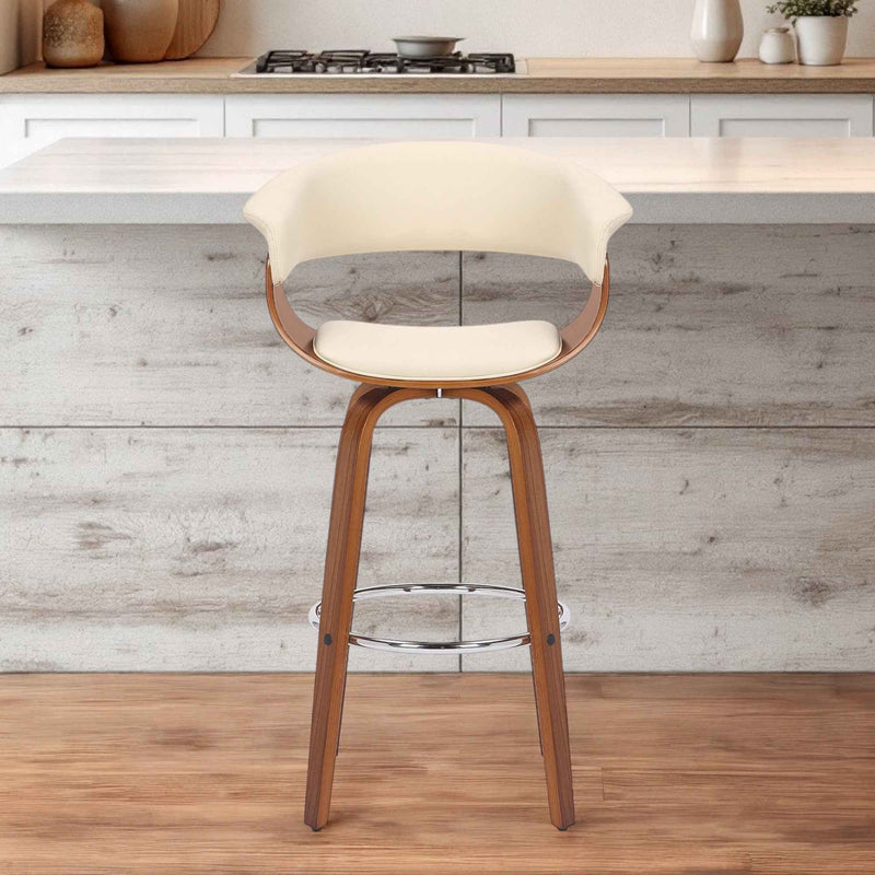 31" Cream And Brown Faux Leather And Solid Wood Swivel Low Back Bar Height Bar Chair Skip to content