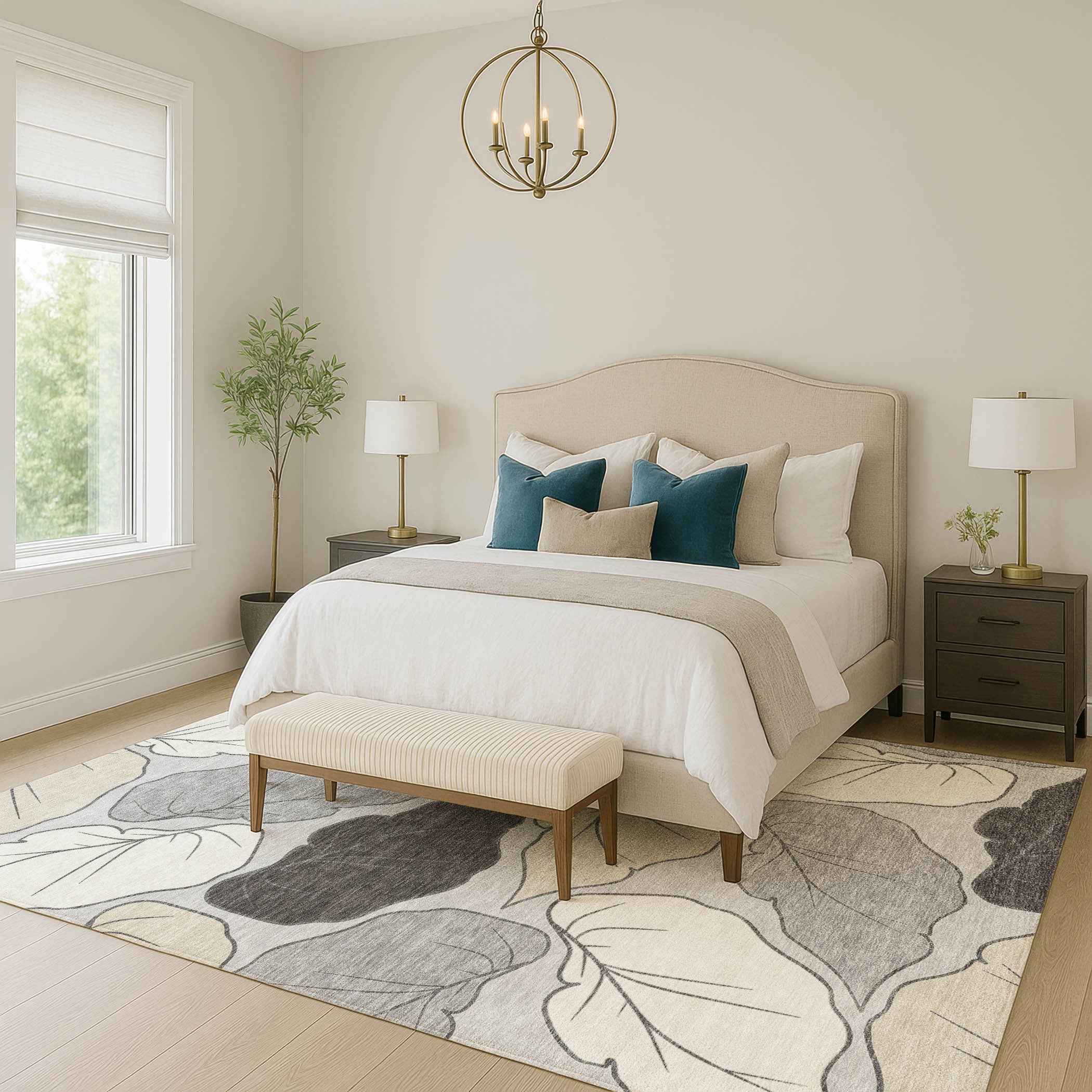 5' X 8' Silver Gray And Beige Botanical Leaves Washable Indoor Outdoor Area Rug
