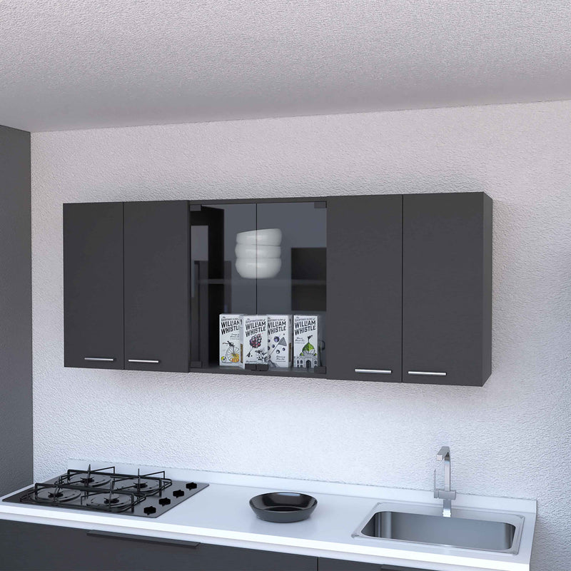 59" Black Wood Wall Mounted China Cabinet With Six Doors