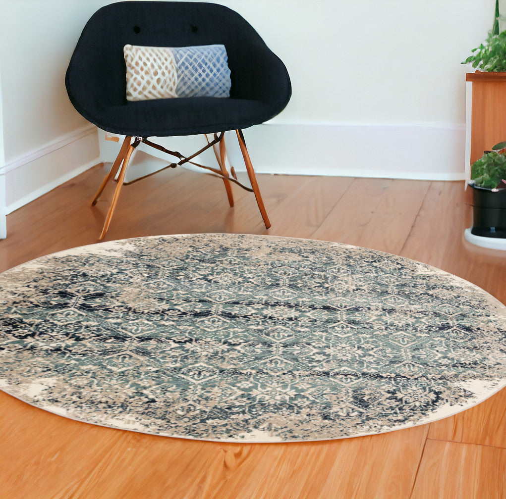 8' Blue And Ivory Round Oriental Dhurrie Area Rug