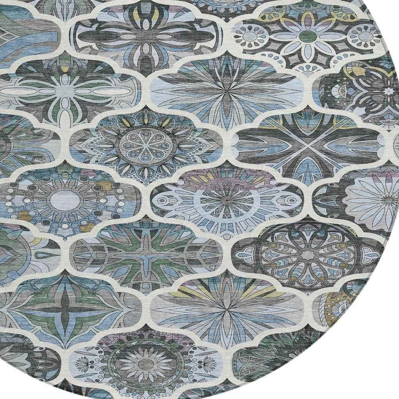 8' Blue And Ivory Round Quatrefoil Washable Indoor Outdoor Area Rug