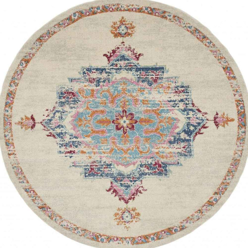 This 8' gray and ivory round power loom area rug, is a great way to add warmth to a room. This superior Turkish rug represents the highest quality and is built to last. Area Rugs help to give warmth and sense of home to your space. 1" H x 96" W x 96" D