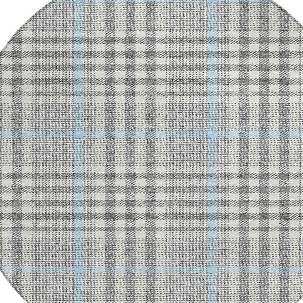 8' Gray Blue And Beige Round Plaid Washable Indoor Outdoor Area Rug