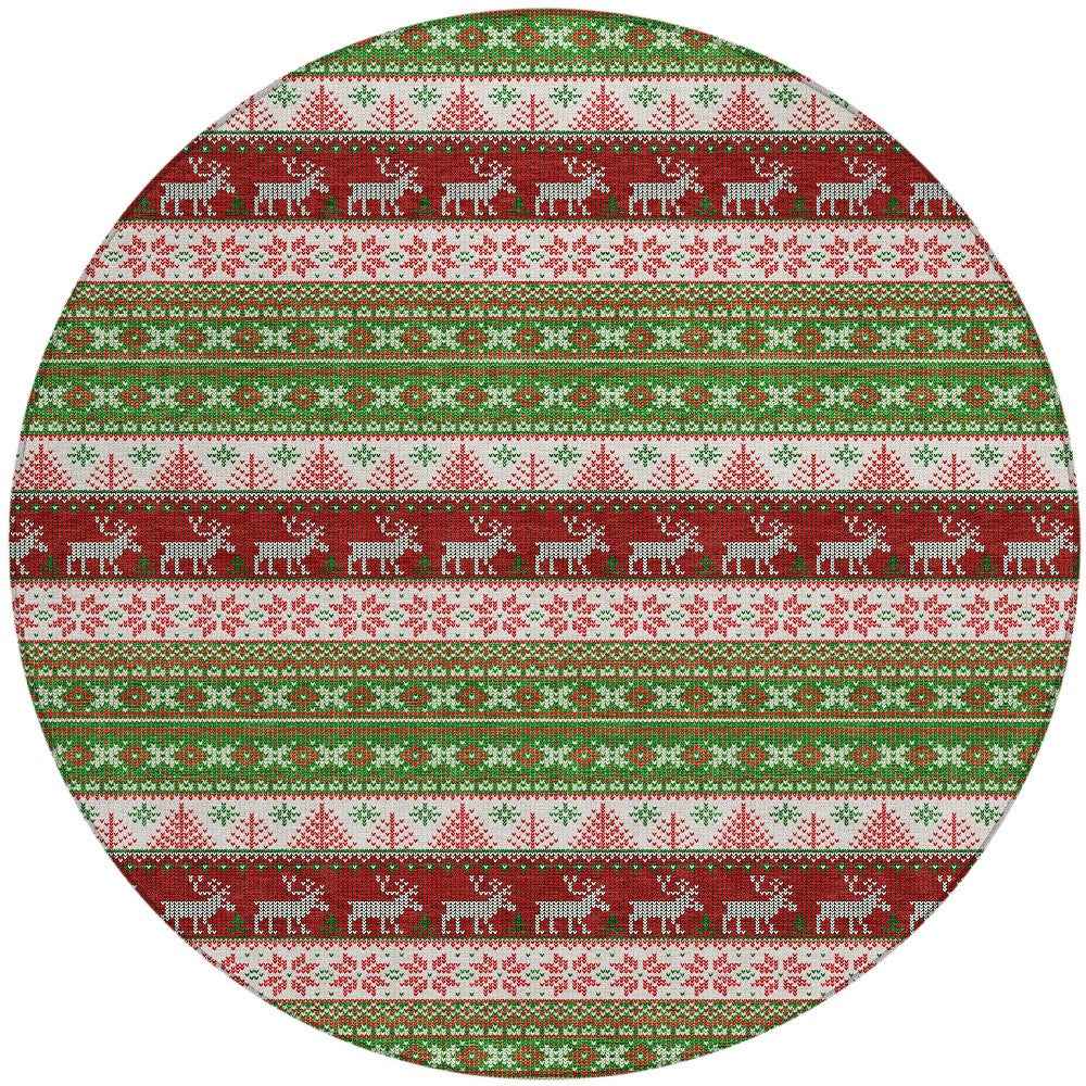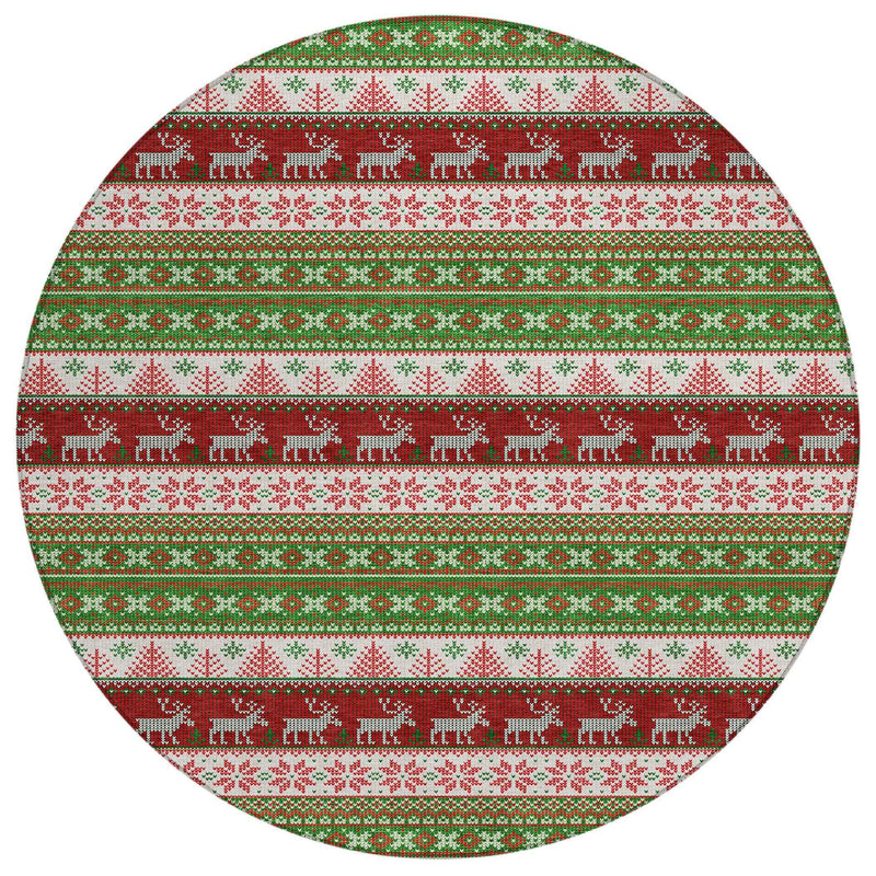 8' Green Ivory And Red Round Animal Print Washable Indoor Outdoor Area Rug