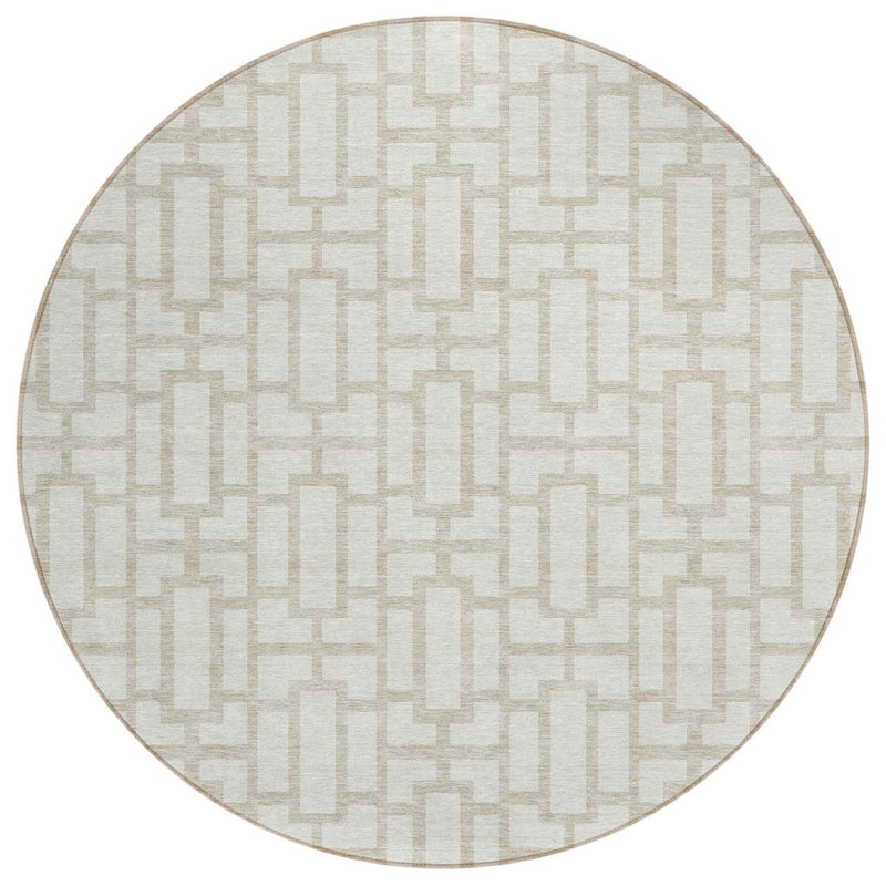 8' Ivory And Beige Round Geometric Washable Indoor Outdoor Area Rug