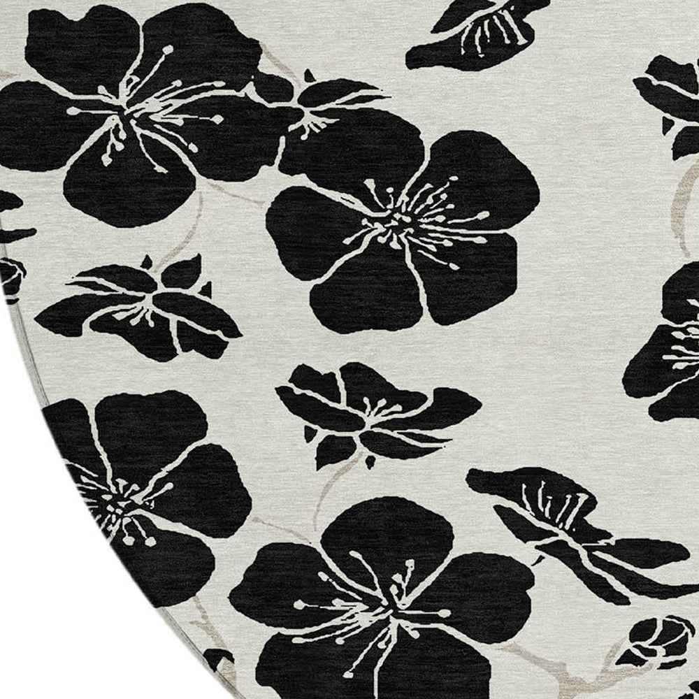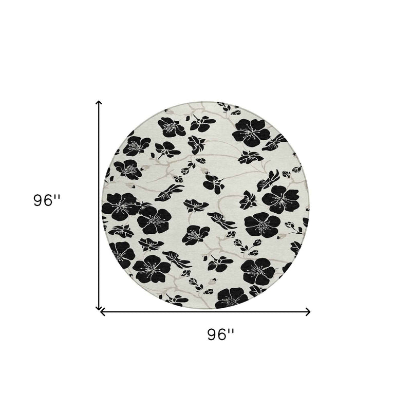 8' Ivory And Black Round Floral Washable Indoor Outdoor Area Rug