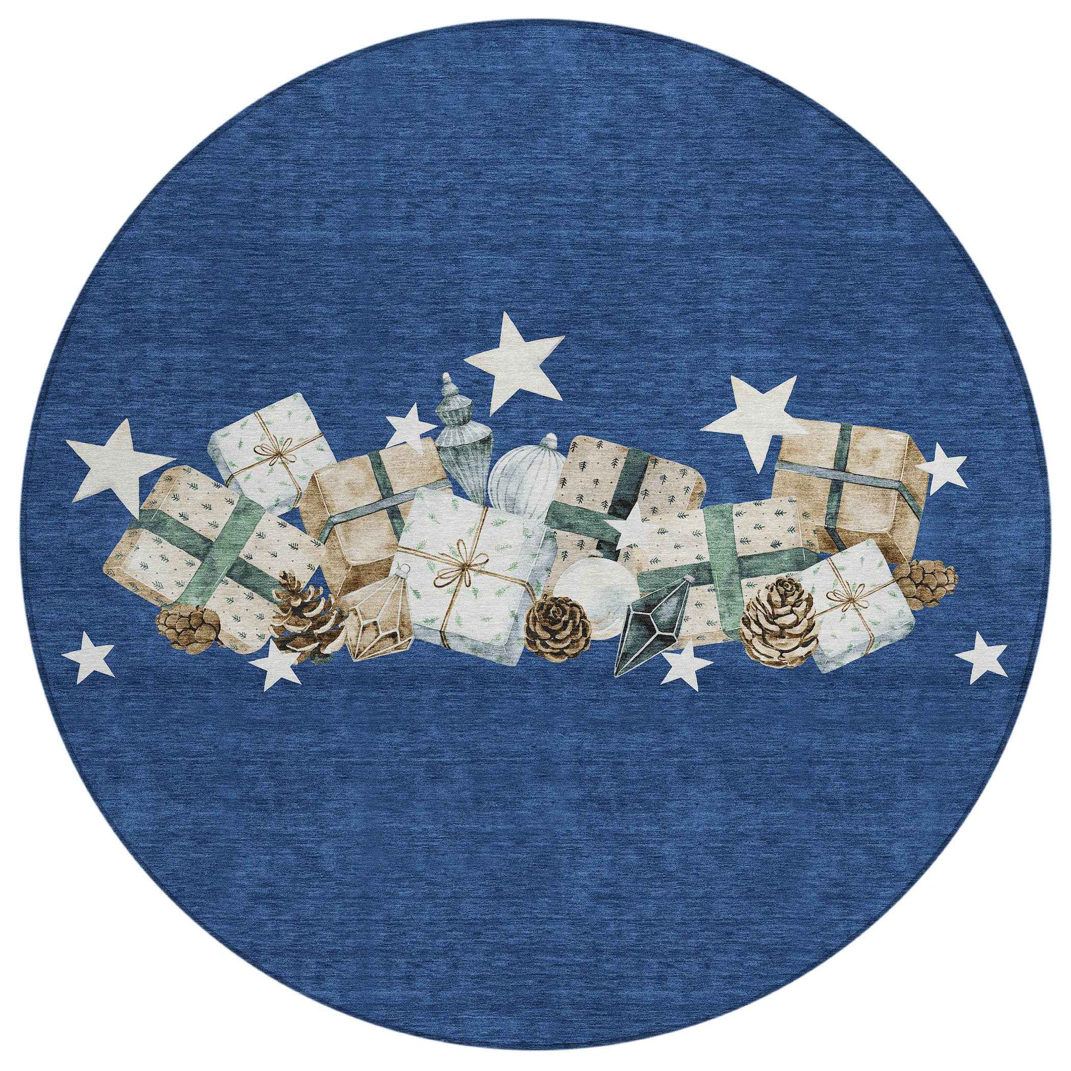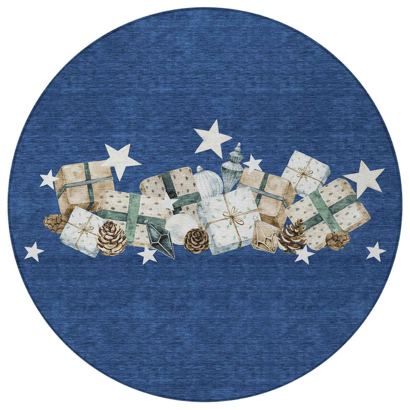 8' Navy Blue Beige Ivory And Taupe Round Geometric Washable Indoor Outdoor Area Rug