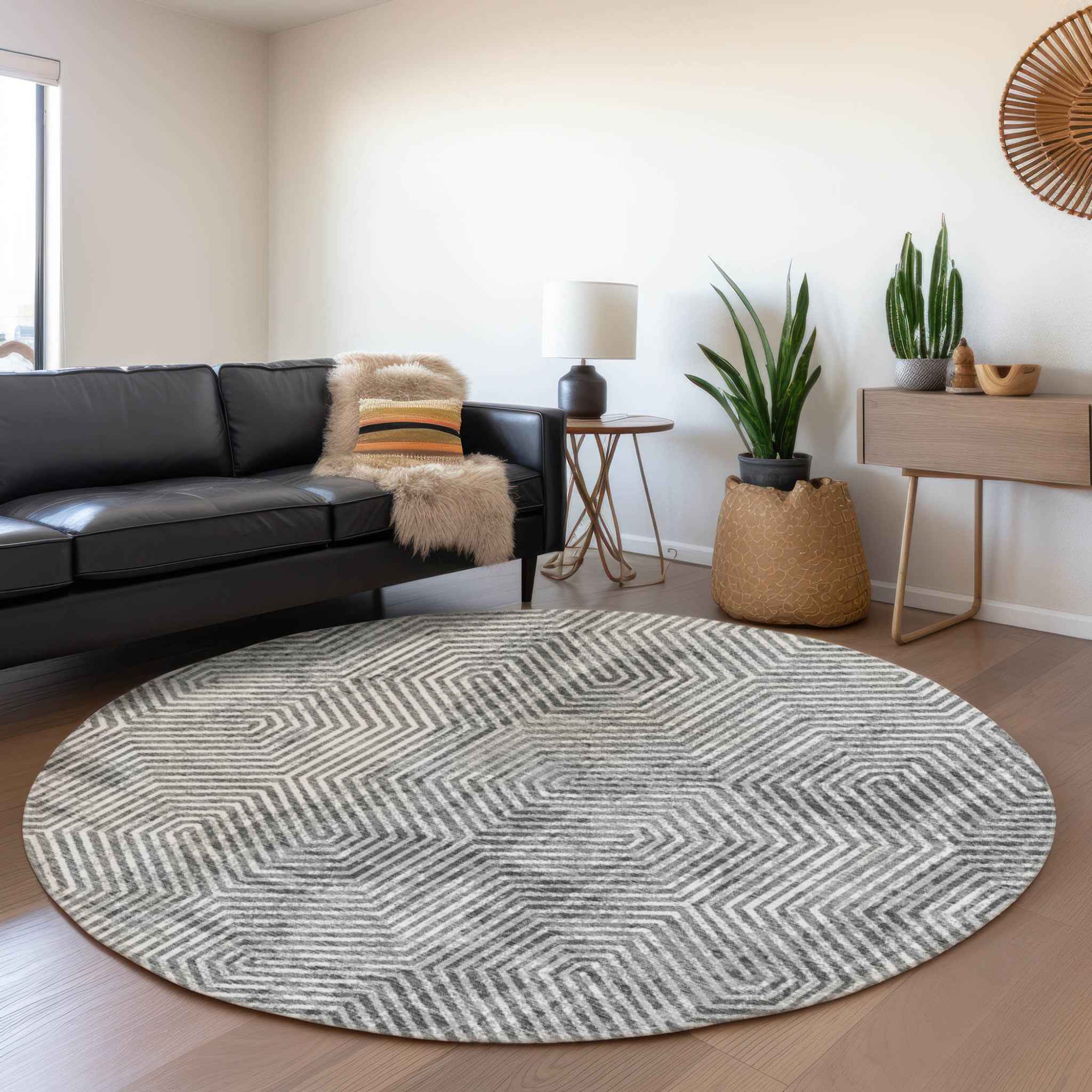 8' Silver And Gray Round Geometric Washable Indoor Outdoor Area Rug