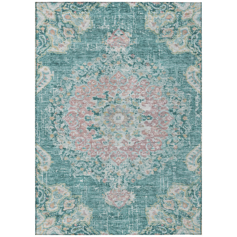 Add some artistry to your room with this 8-foot x 10-foot teal blue floral medallion washable indoor outdoor area rug. This rectangle shaped rug features a floral medallion design that will work well both indoors or out. A classic shape marries with good looking design for your living room, hall, bedroom, porch, patio, or poolside. Ideal for outdoor spaces or high traffic areas with kids and pets, this rug is made from heavy duty polyester that is stain resistant to help repel water, dirt, and stains. Versatile in use, durable, and easy to maintain, this rug is an ideal solution to add a decorative and inviting touch to your indoor or outdoor space. 96-inch h x 120-inch w x 0.19-inch d.