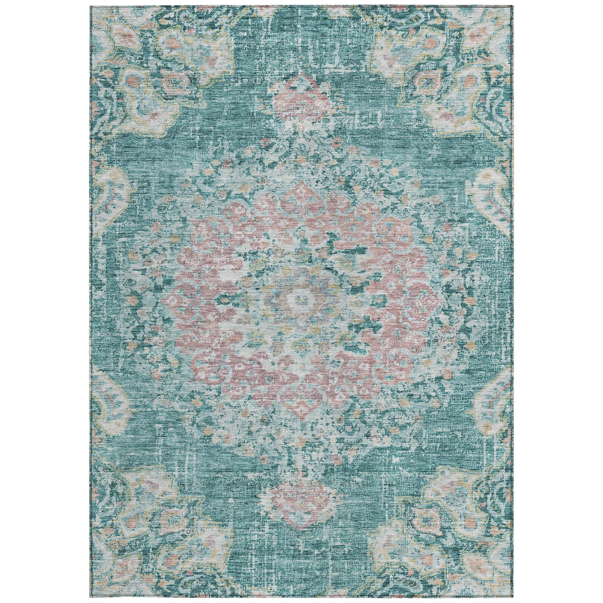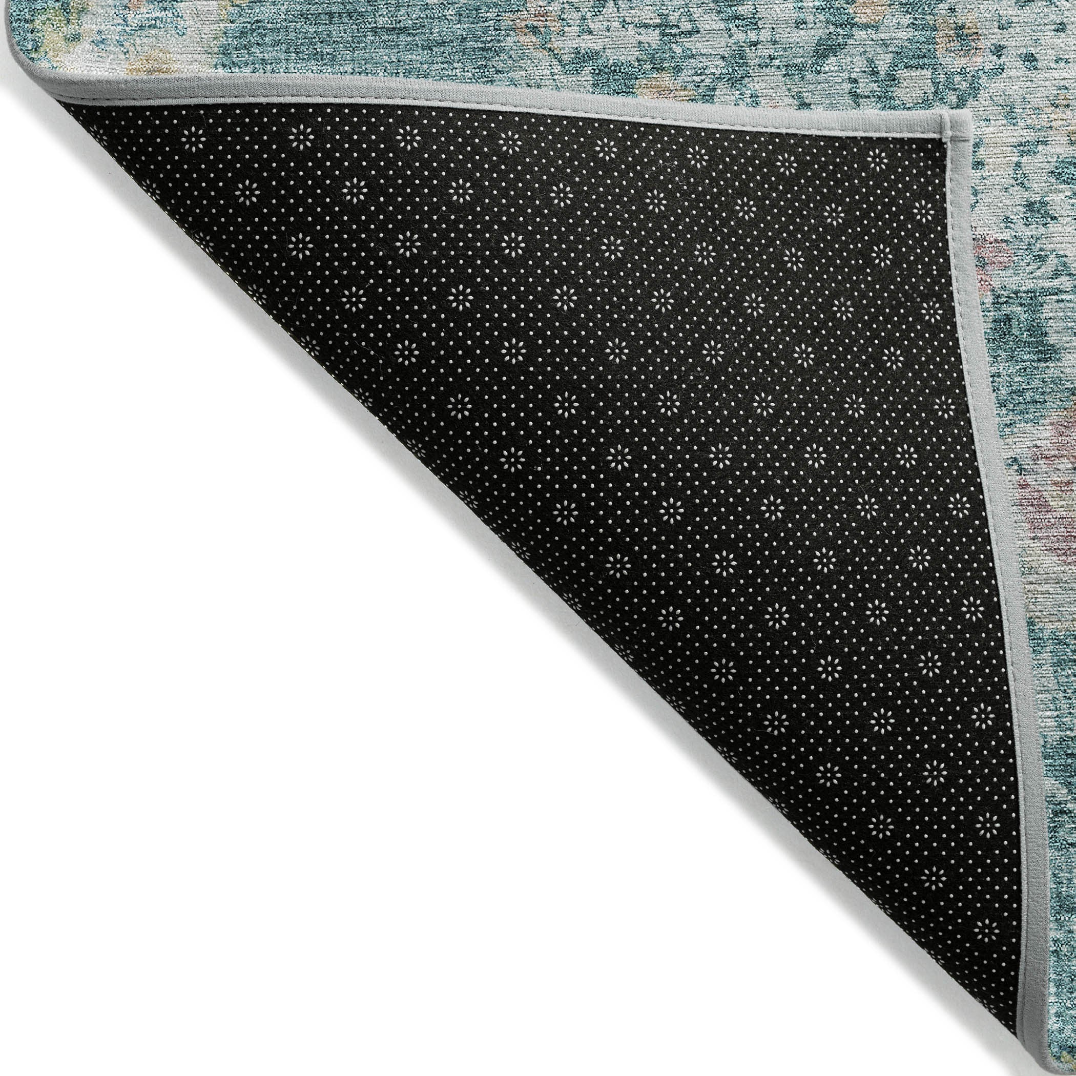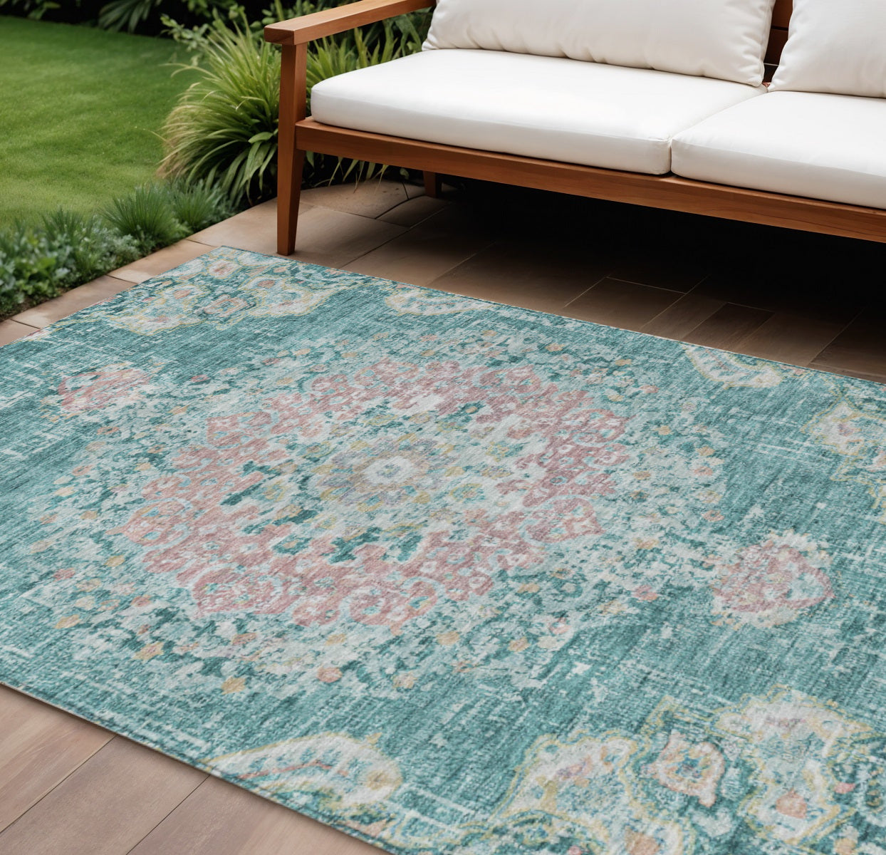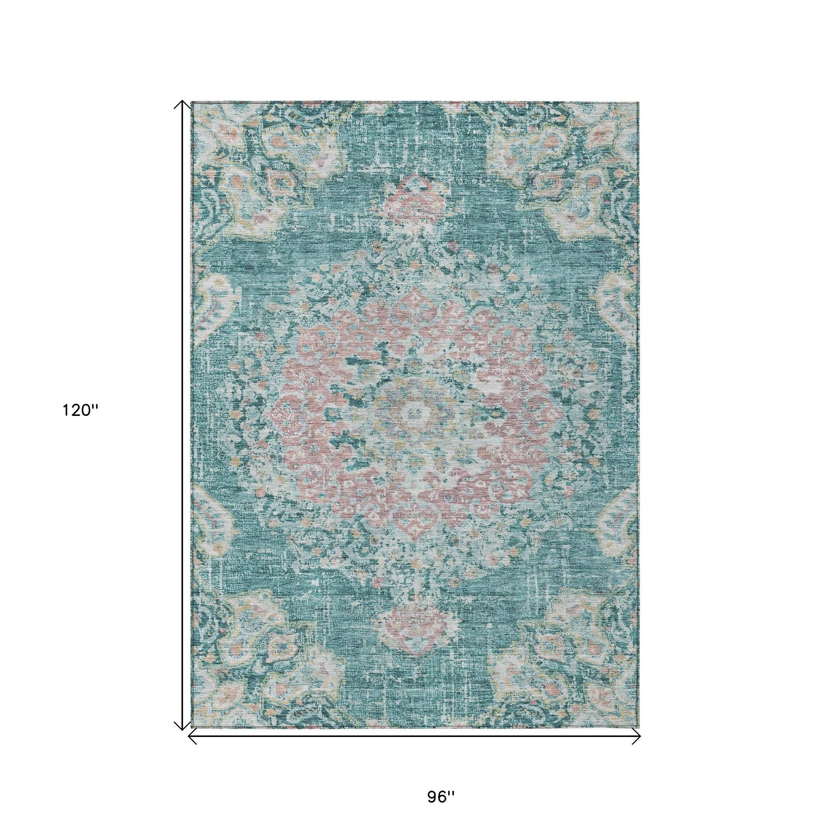 8' X 10' Teal Blue Floral Medallion Washable Indoor Outdoor Area Rug