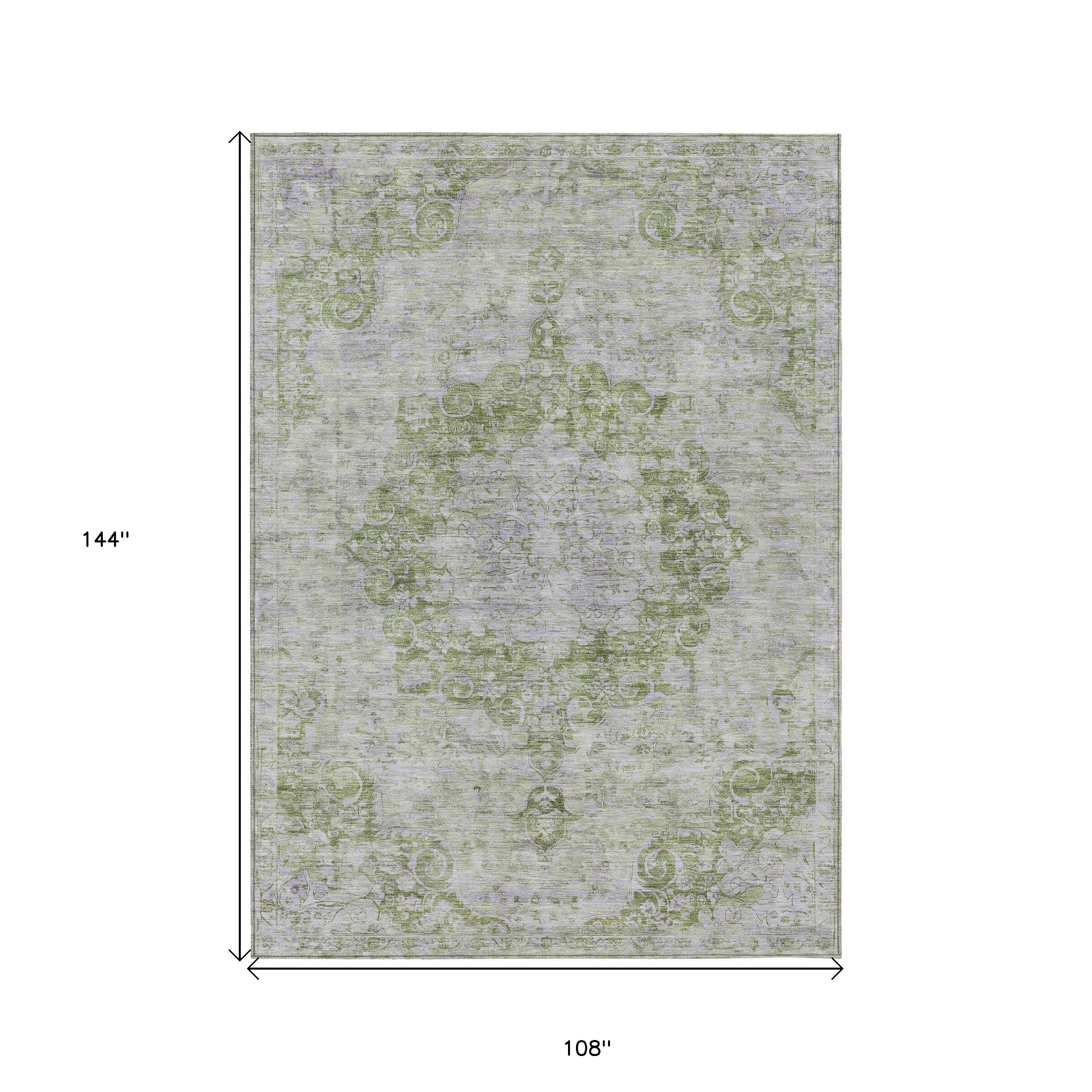 9' X 12' Olive Green Floral Medallion Washable Indoor Outdoor Area Rug