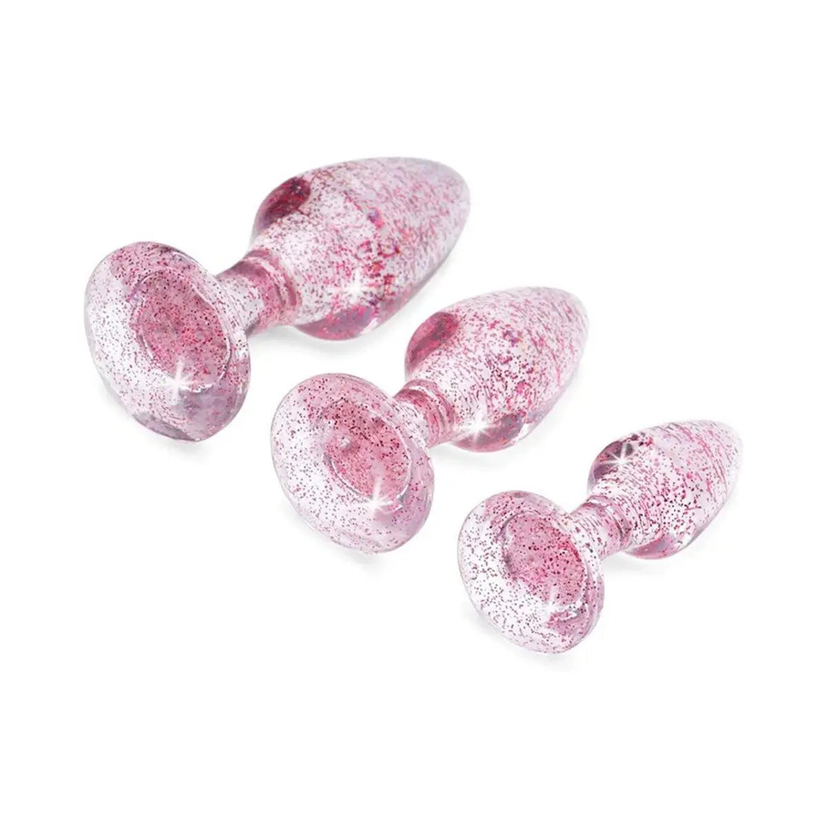 Elevate your backdoor lovin' with three gorgeous glittery anal plugs. Each set includes small, medium, and large plugs perfect for starting small and training your way to huge pleasure. And they're made from firm and smooth acrylic swirled with sparkling pink glitter, so they're guaranteed to make eyes pop and jaws drop!