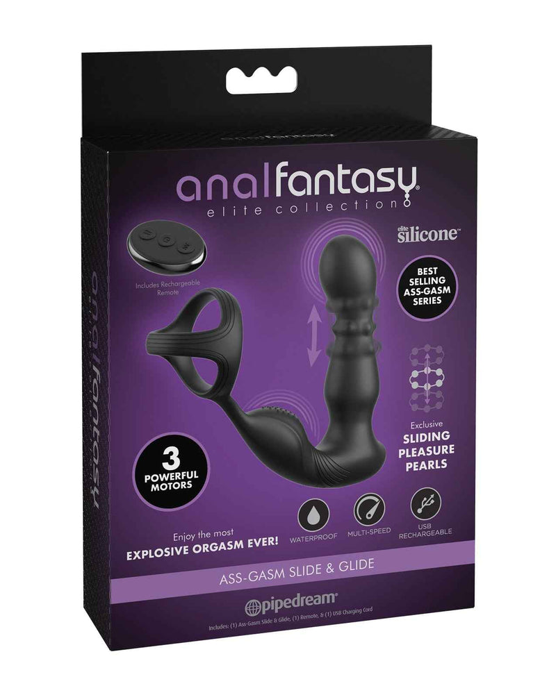 Indulge in the latest innovation in perineum and prostate play with the Anal Fantasy Elite Collection Ass-Gasm Slide & Glide. Based on our best-selling Ass-Gasm framework, we've added an exclusive, sliding ring of pleasure pearls designed to elevate P-Spot stimulation to unparalleled heights. Thrill yourself with 10 unique functions, as the pleasure pearls glide along the shaft of the P-Spot plug, producing tantalizing friction and stimulation like you've never felt before. With the plug in your ass and the ring wrapped snug around your cock and balls, you'll enjoy the most explosive ass-gasm ever!