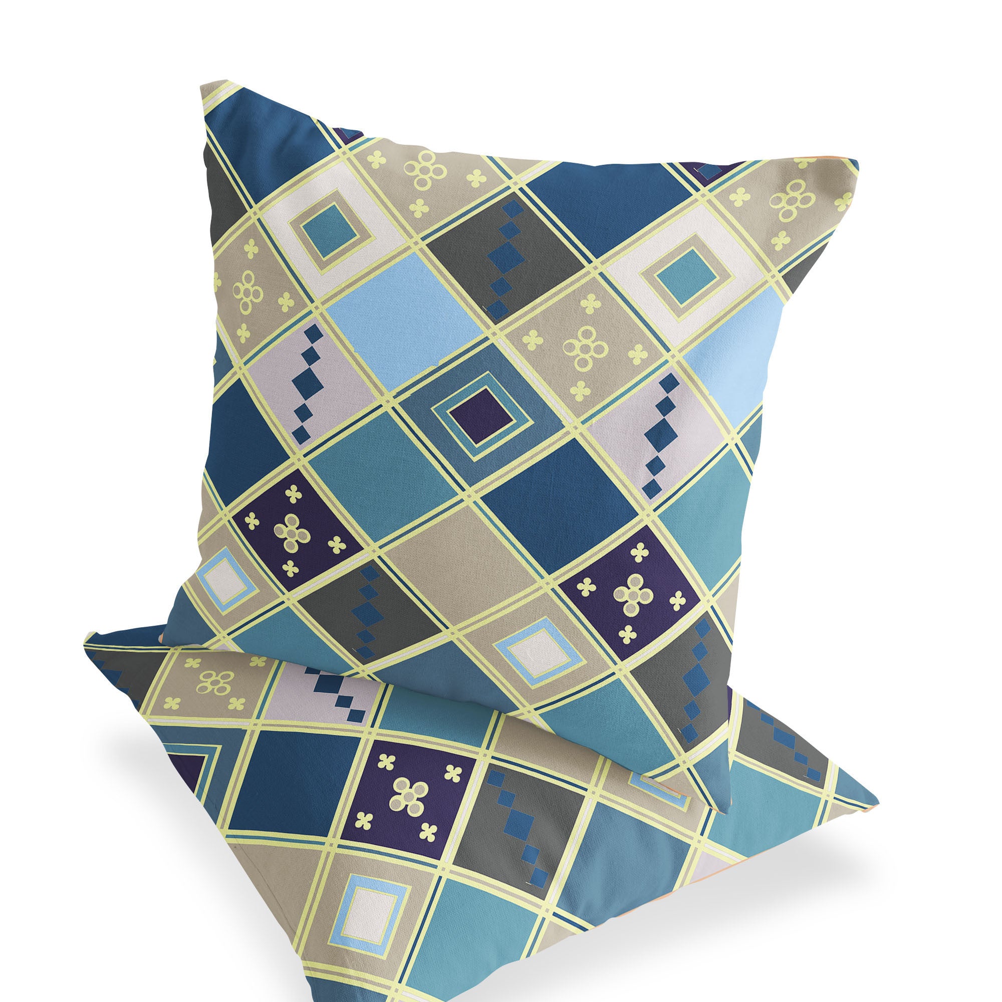 Set of Two 16" X 16" Blue and Gold Blown Seam Diamond Indoor Outdoor Throw Pillow Skip to content