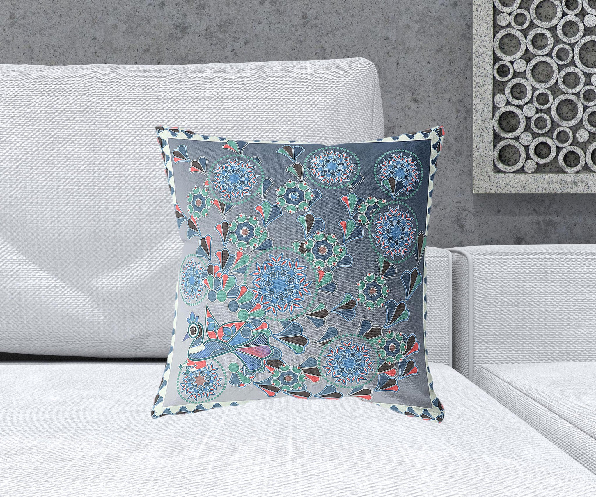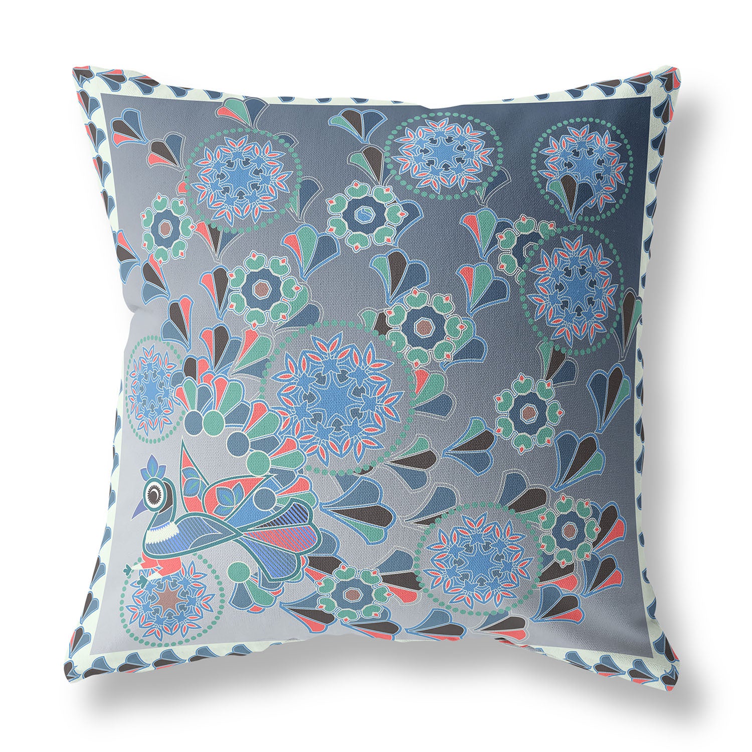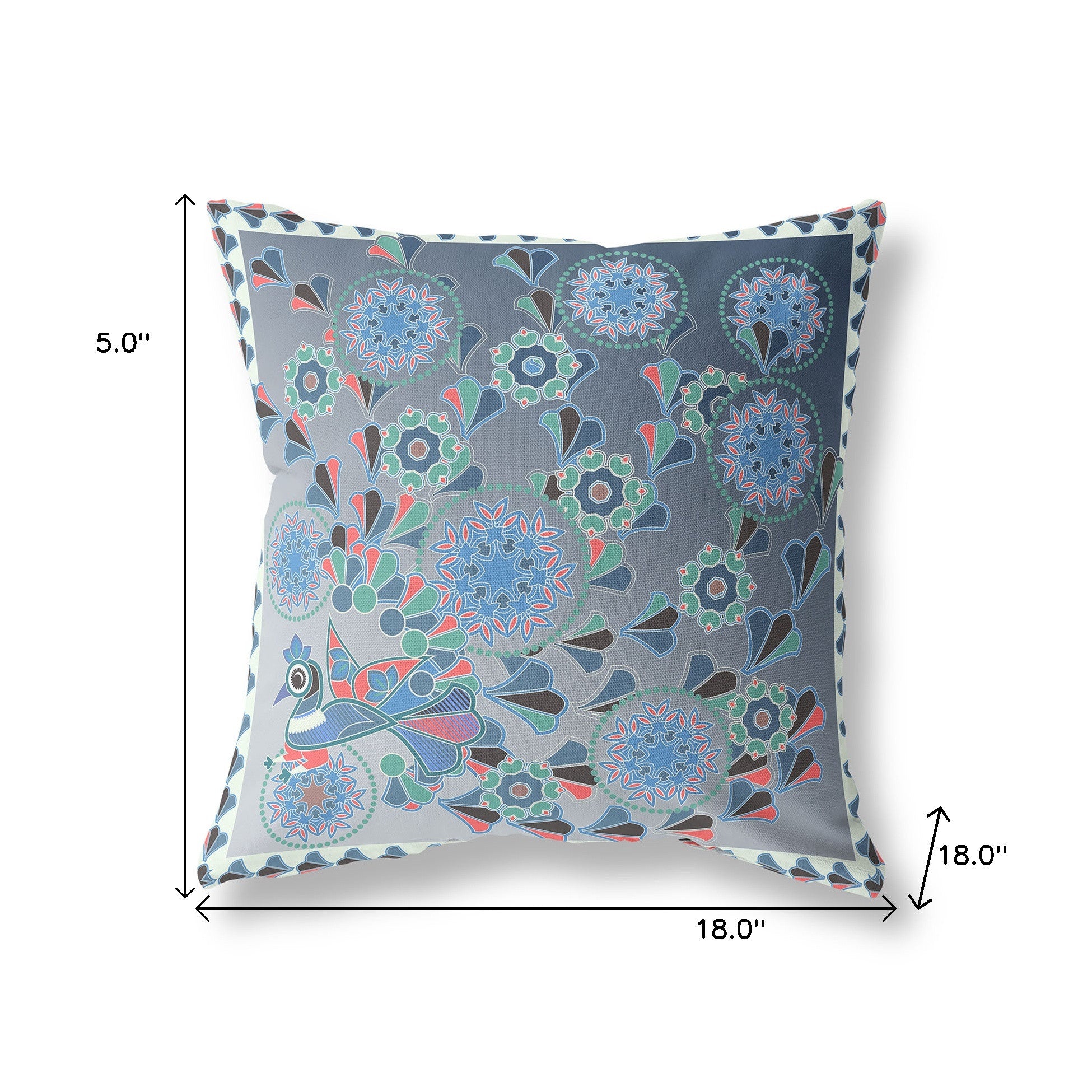 18" x 18" Blue and White Peacock Blown Seam Floral Indoor Outdoor Throw Pillow