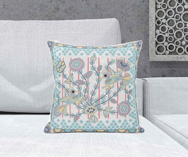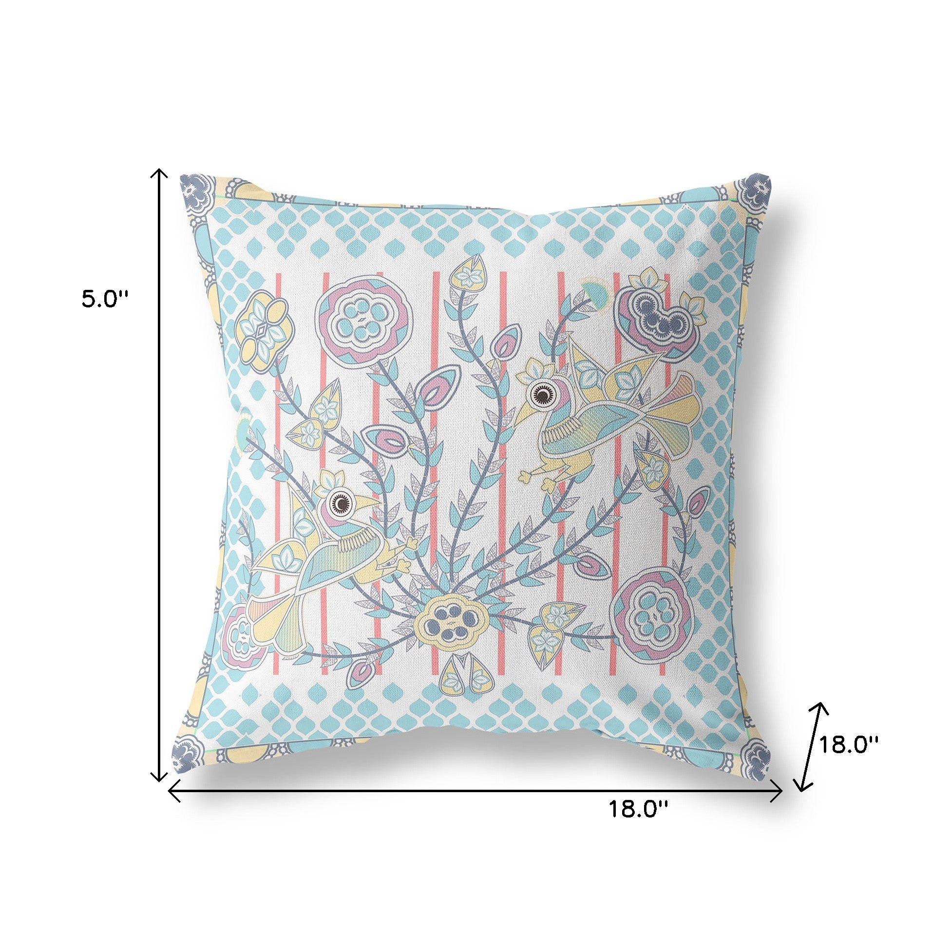 18" X 18" White And Yellow Bird Blown Seam Floral Indoor Outdoor Throw Pillow