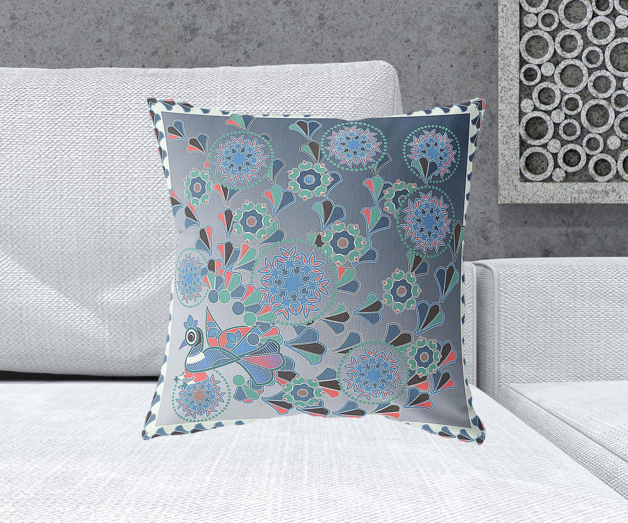 20" x 20" Blue and White Peacock Blown Seam Floral Indoor Outdoor Throw Pillow
