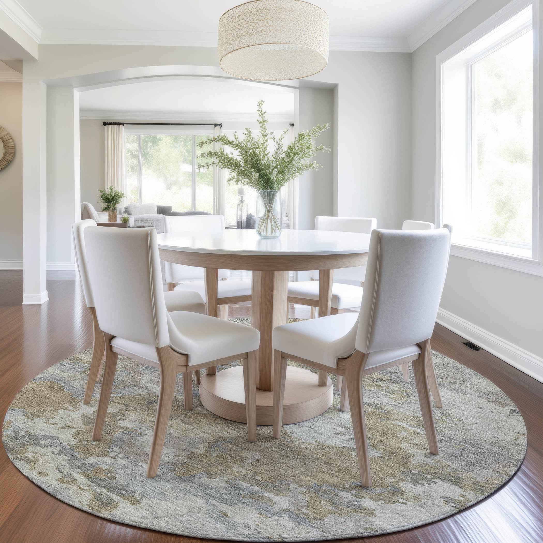 8' Gold And Ivory Round Abstract Washable Indoor Outdoor Area Rug