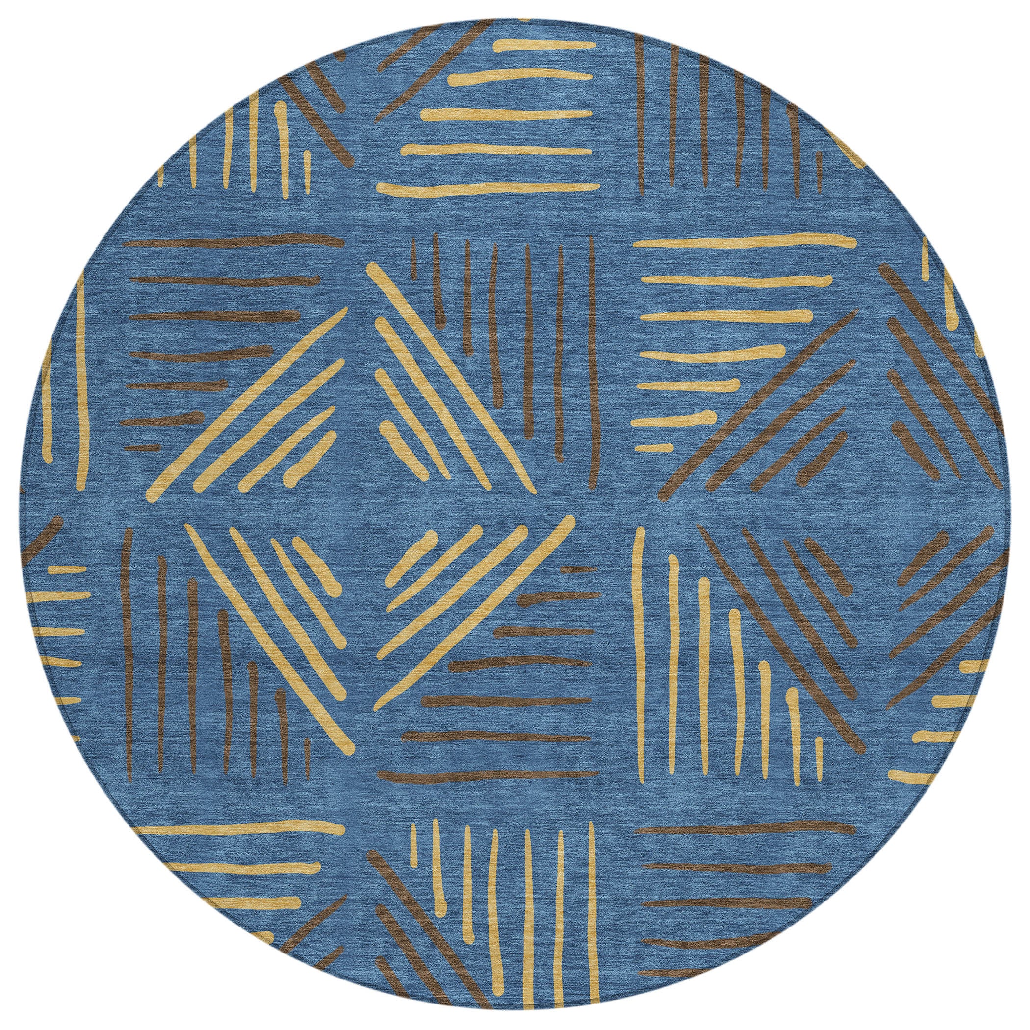 8' Navy Blue And Gold Round Geometric Washable Indoor Outdoor Area Rug