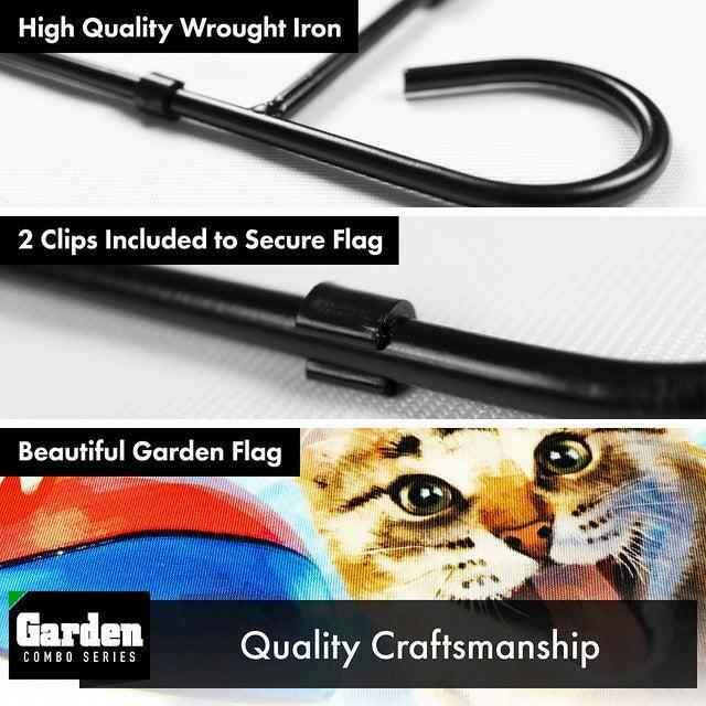 - SPECS: Garden Flag Stand is 36" x 16" after assembly from black iron 3 piece set; Summer Fun with Cat in Pool flag is a 12"x18" size vertical polyester garden flag. Imported, 100% Polyester Flag