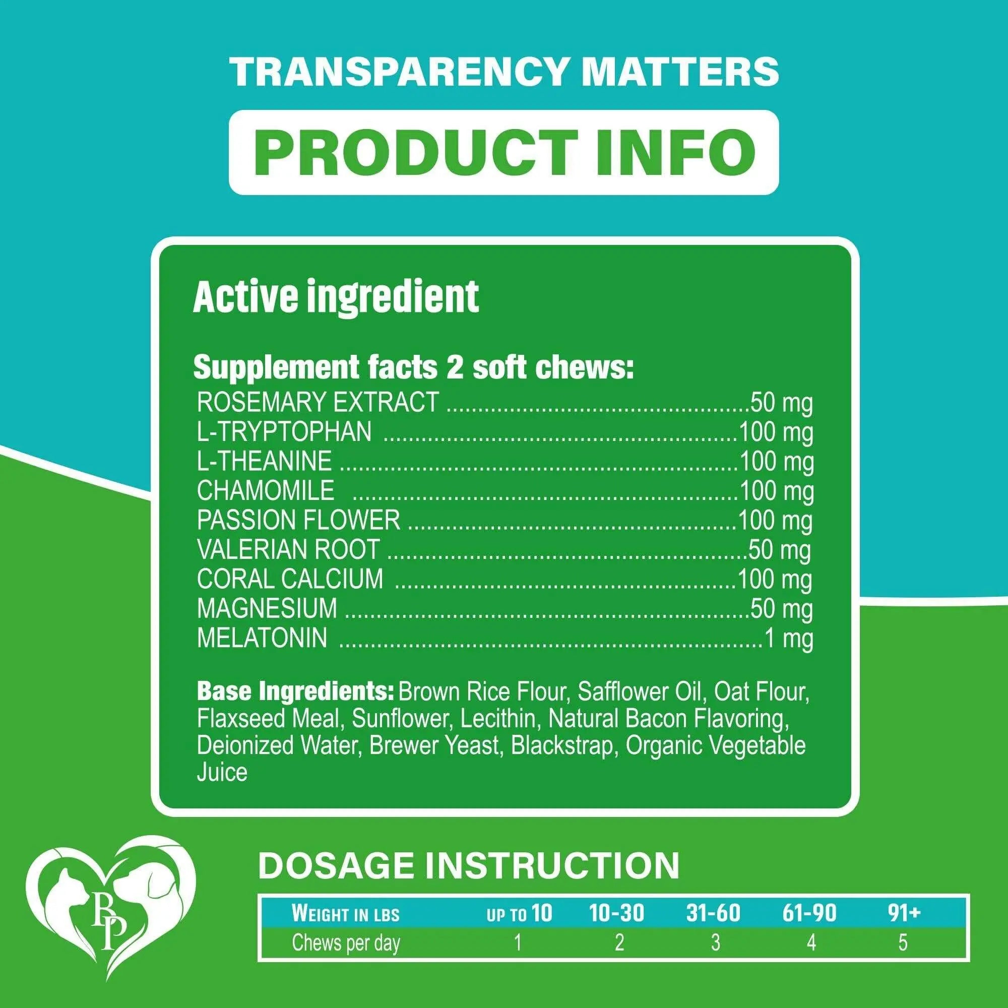 RECOMMENDED SERVING PER DAY ANY AGE OR BREED : up to 10 LBS - 1 soft chew per day, 10-30 LBS - 2 chews per day, 31-60 LBS - 3 chews per day, 61-90 LBS - 4 chews per day and over 90 LBS large dogs - 5 chews. Organic meds & remedy supplement are best replacement for collar, travel spray, vest, toys, tablets, pills, drops, calmer diffuser, plug, refill kit.