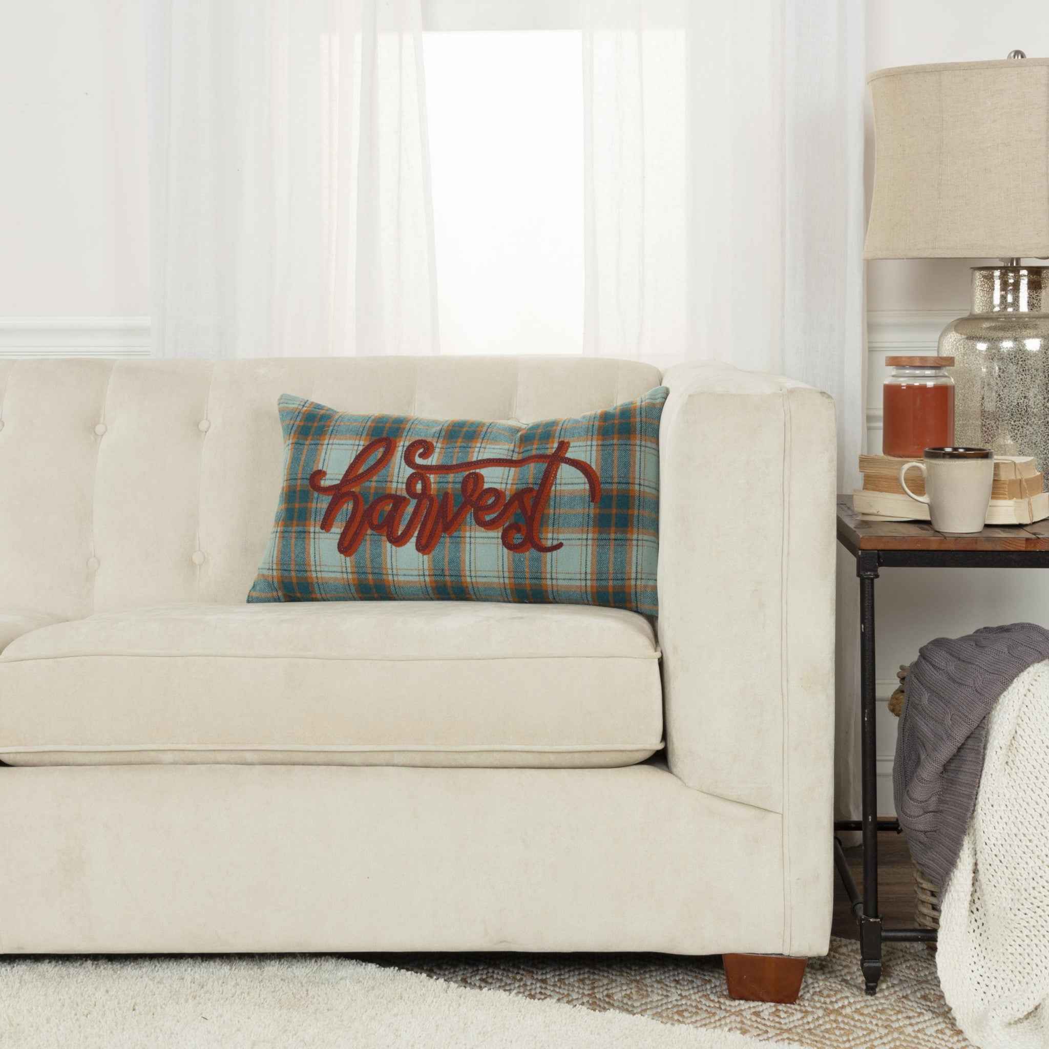 14" X 14" Blue and Orange Thanksgiving Wool Blend Pillow With Embroidery Edges