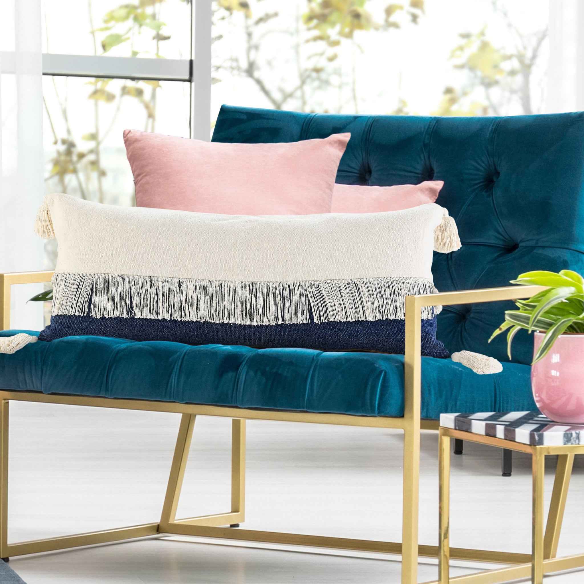 14" X 36" Denim Blue And Off-White 100% Cotton Zippered Pillow - Vai al contenuto