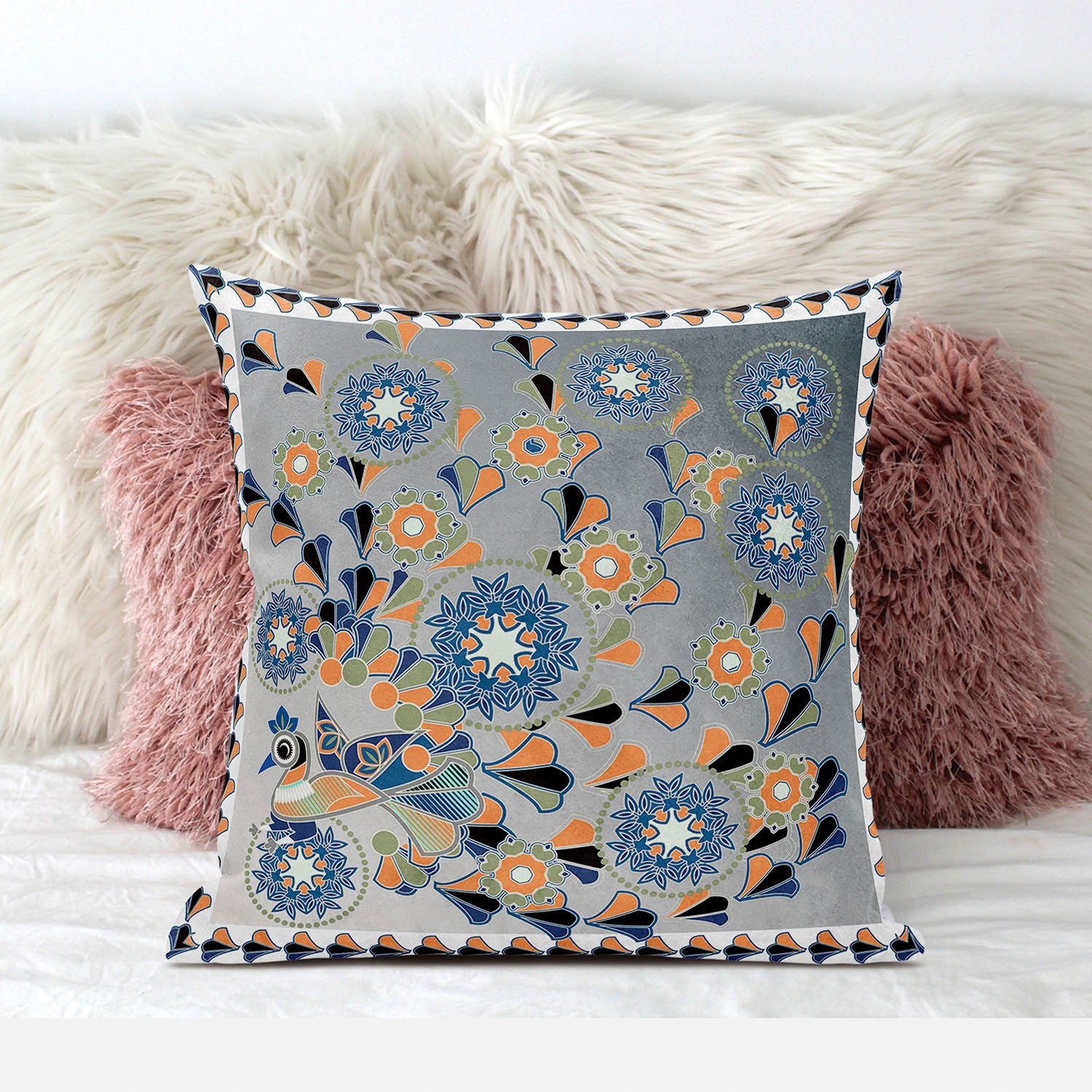 18" x 18" Gray and White Peacock Blown Seam Floral Indoor Outdoor Throw Pillow