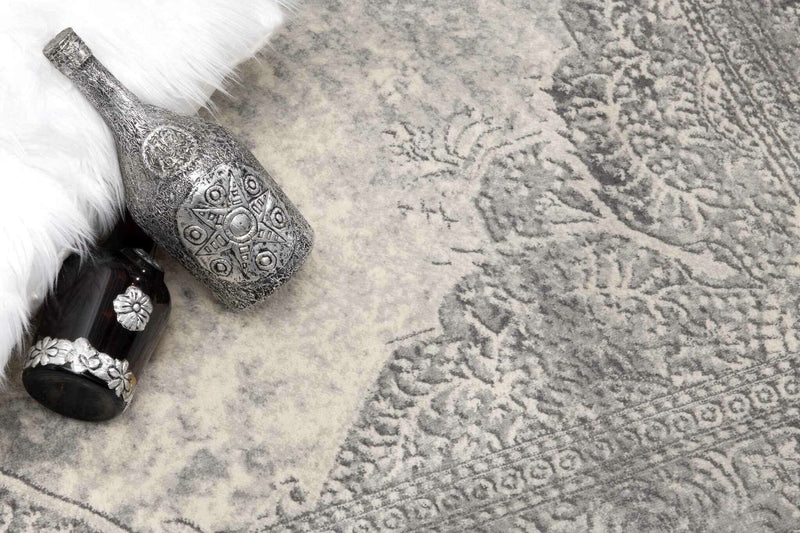 Wrapped in simplicity with traditional motifs and modern hues, this Gray Distressed Medallion Area Rug will serve as a classic accent to complement the aesthetics of your home. The four-petaled floral medallion in the center is extravagantly detailed in gray with a richly decorative border all-around lying over a distressed dove gray base. Made in Turkey with 100% polypropylene to stand the test of durability and resist stains in high traffic indoor areas. The high-low pile construction adds to a surface texture for a luxurious look with a soft and sumptuous feel under the feet. Roll this aesthetically pleasing area rug against a dark-colored floor to let it speak through its understated elegance. 60” x 27” x 0.4”