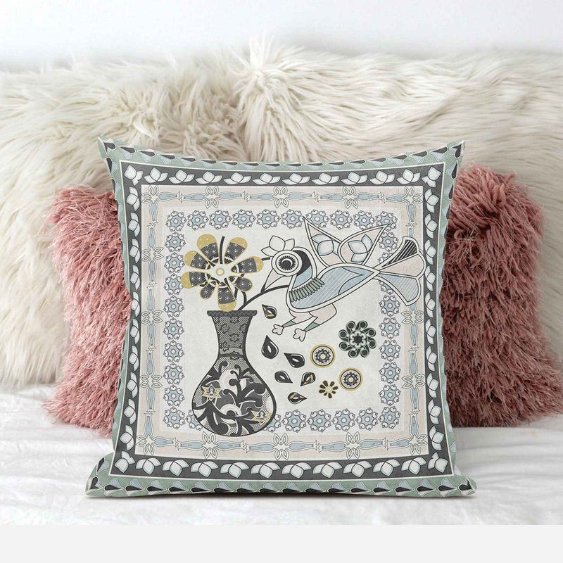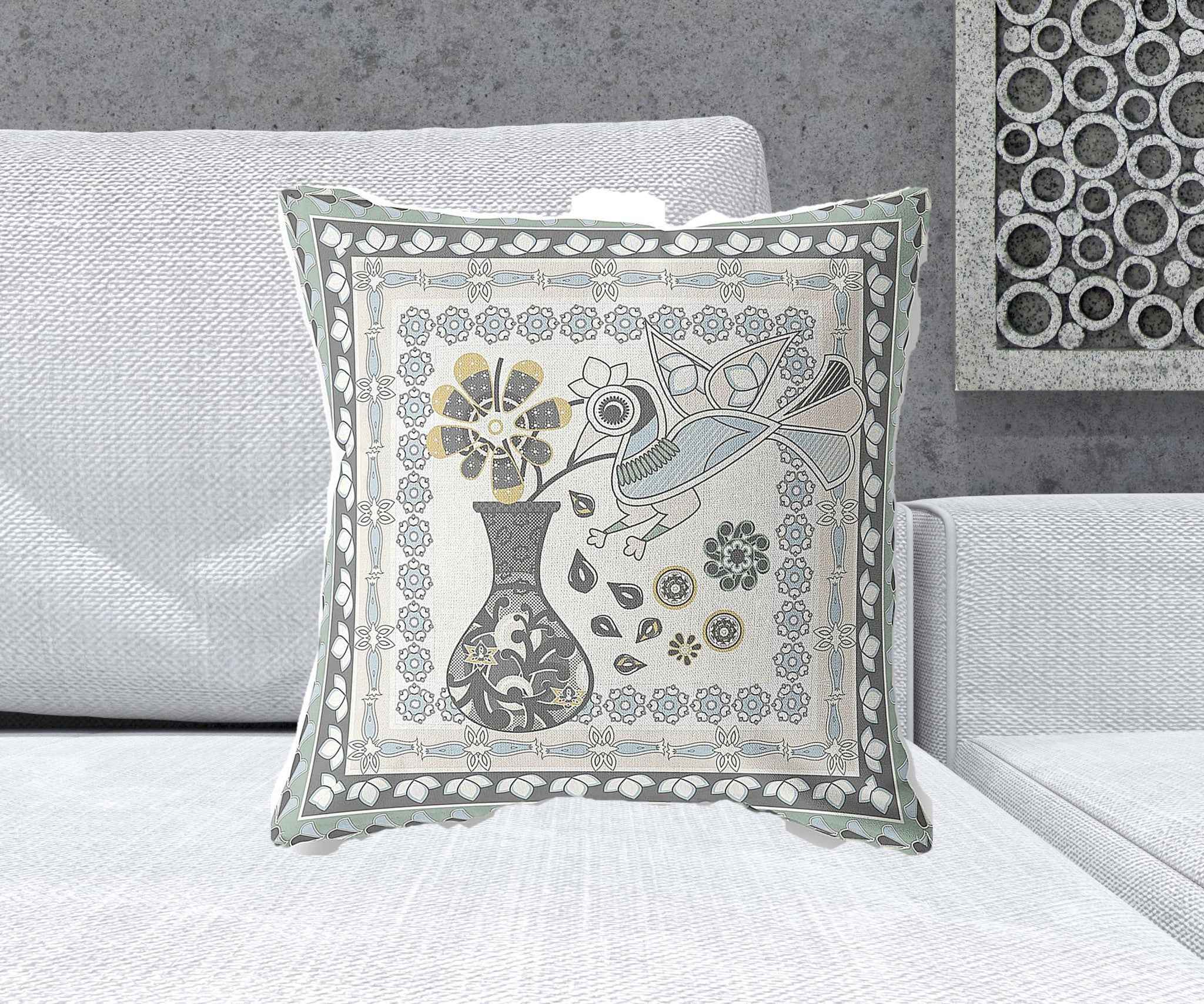 20" x 20" Cream Peacock Blown Seam Floral Indoor Outdoor Throw Pillow