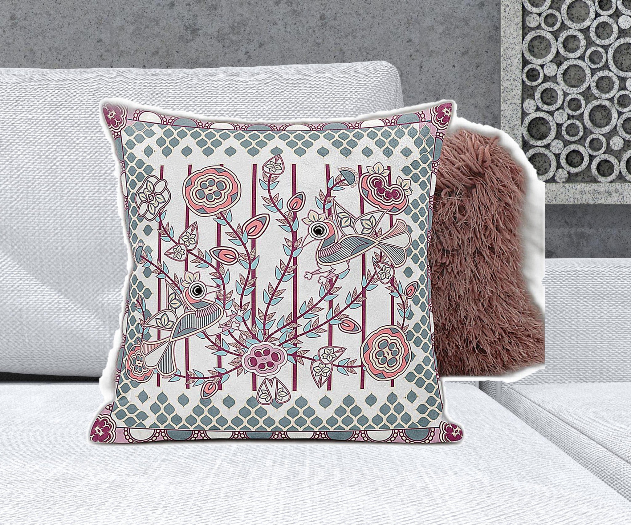 20" X 20" White And Magenta Bird Blown Seam Floral Indoor Outdoor Throw Pillow