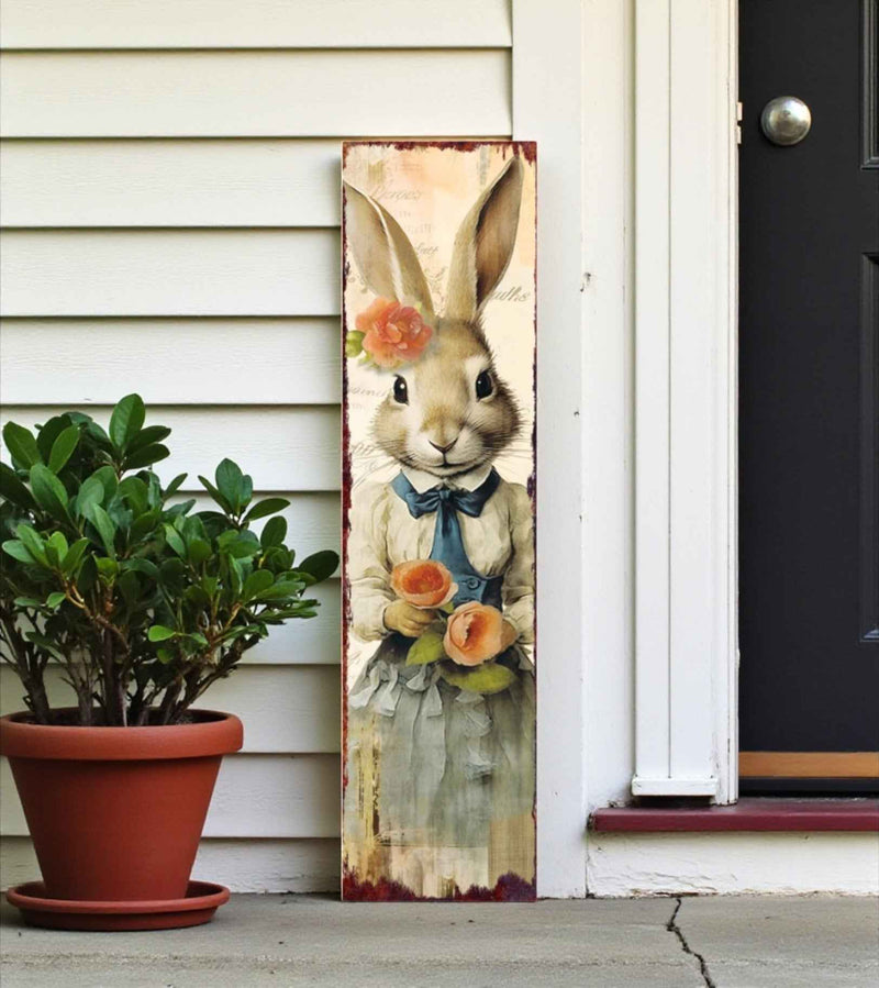 The 36-inch off white and blue solid wood bunny porch sign is a charming addition to your outdoor space. Crafted from durable solid wood, this porch sign exudes a rustic style that complements any garden or patio setting. Featuring a delightful bunny design, the vintage style of this girl bunny enhances any entryway, making it a delightful addition for the Easter season, but is neutral enough to be used all year long. Elevate your outdoor decor with this whimsical sign that embodies the spirit of springtime and celebration. It’s a perfect way to express your love for the season while adding warmth to your porch or garden area. 36.00-inch h x 10.00-inch w x 1.00-inch d.