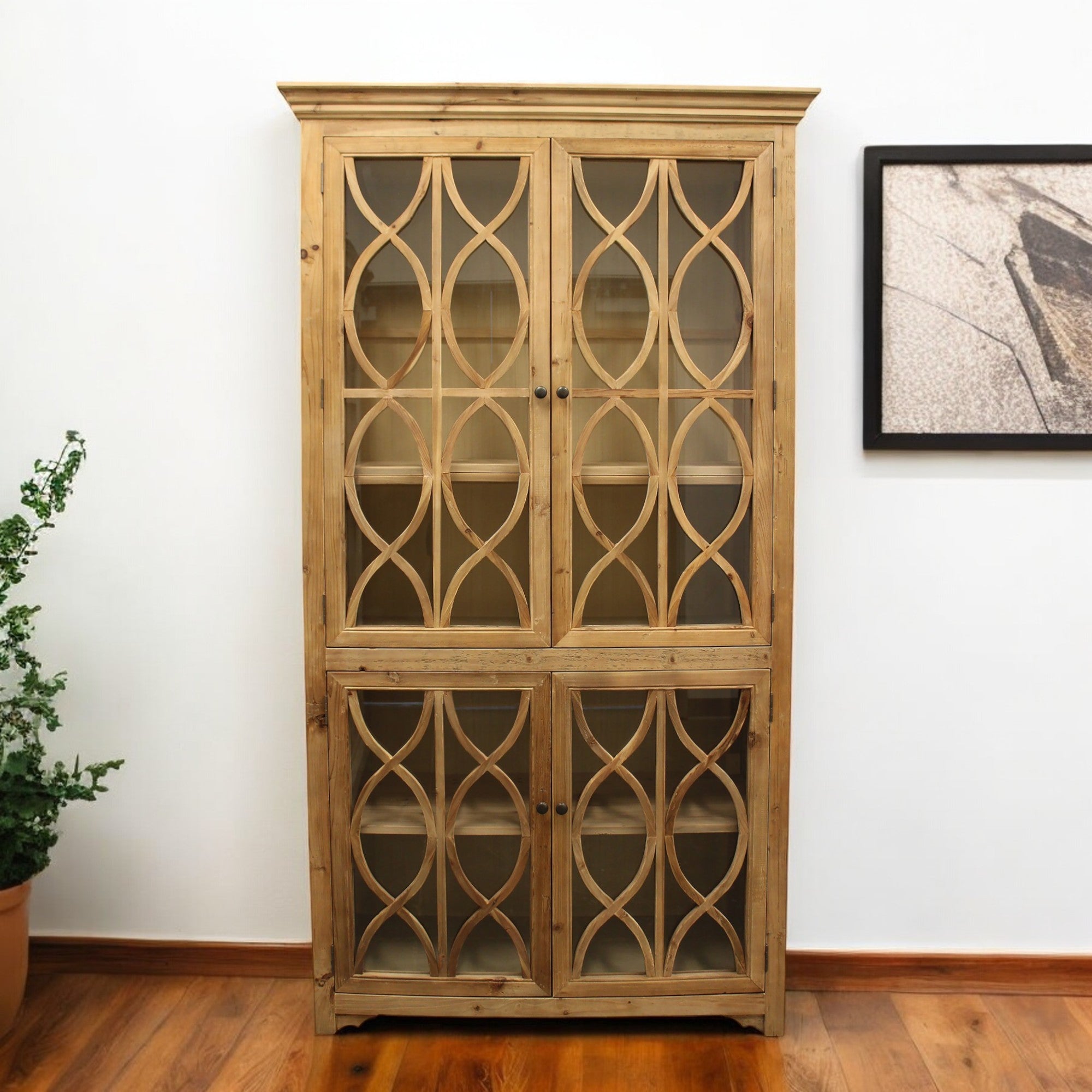 47" Natural Solid Wood Carved Geometric Accent Cabinet With Four Doors