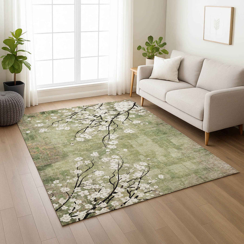 5' X 8' Artichoke Green Ivory And Charcoal Floral Washable Indoor Outdoor Area Rug