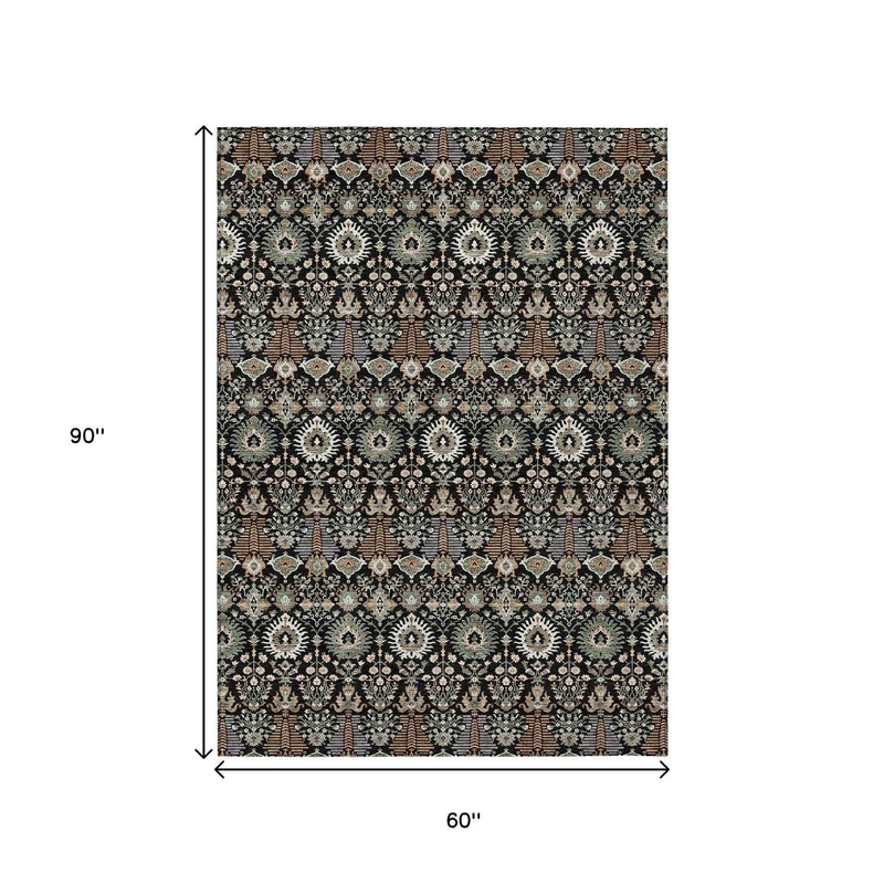 5' X 8' Black And Ivory Floral Washable Indoor Outdoor Area Rug