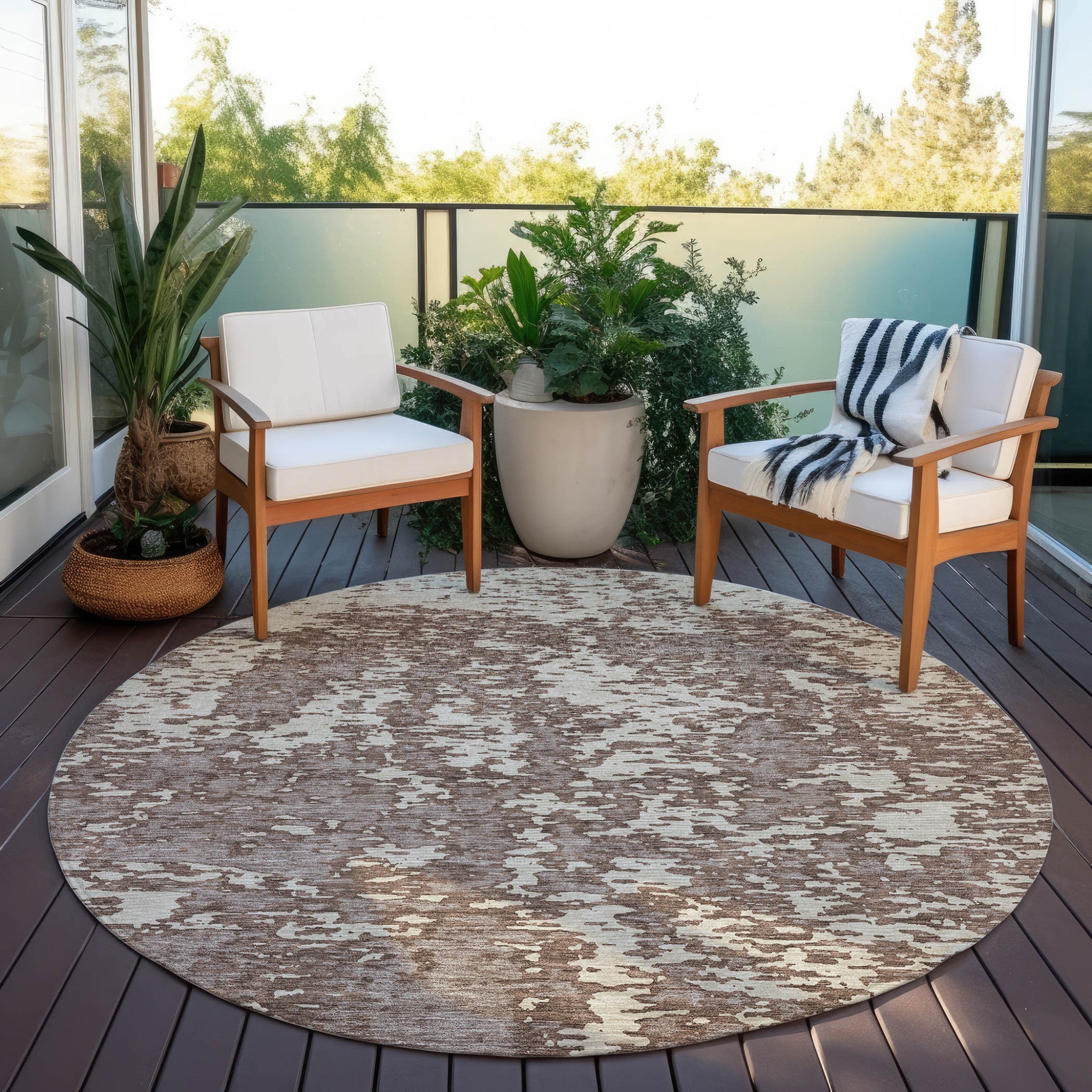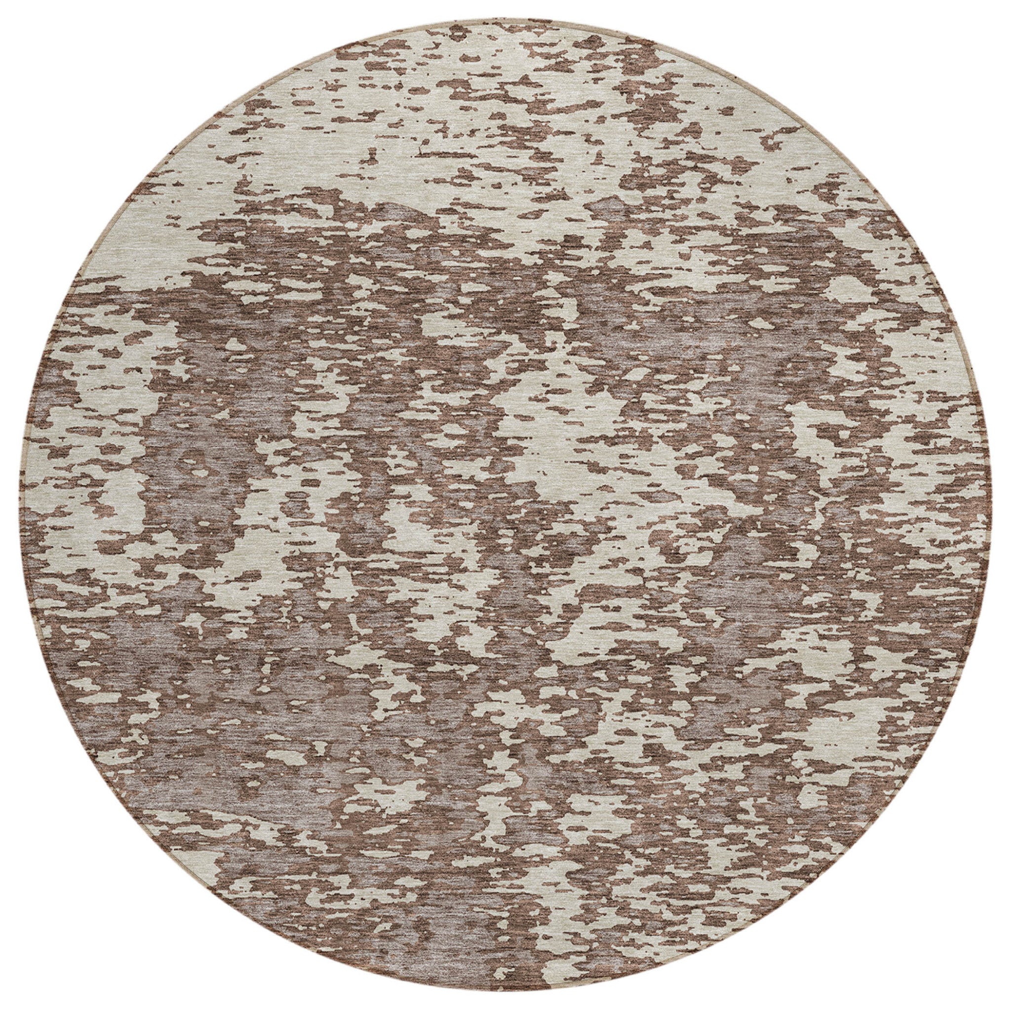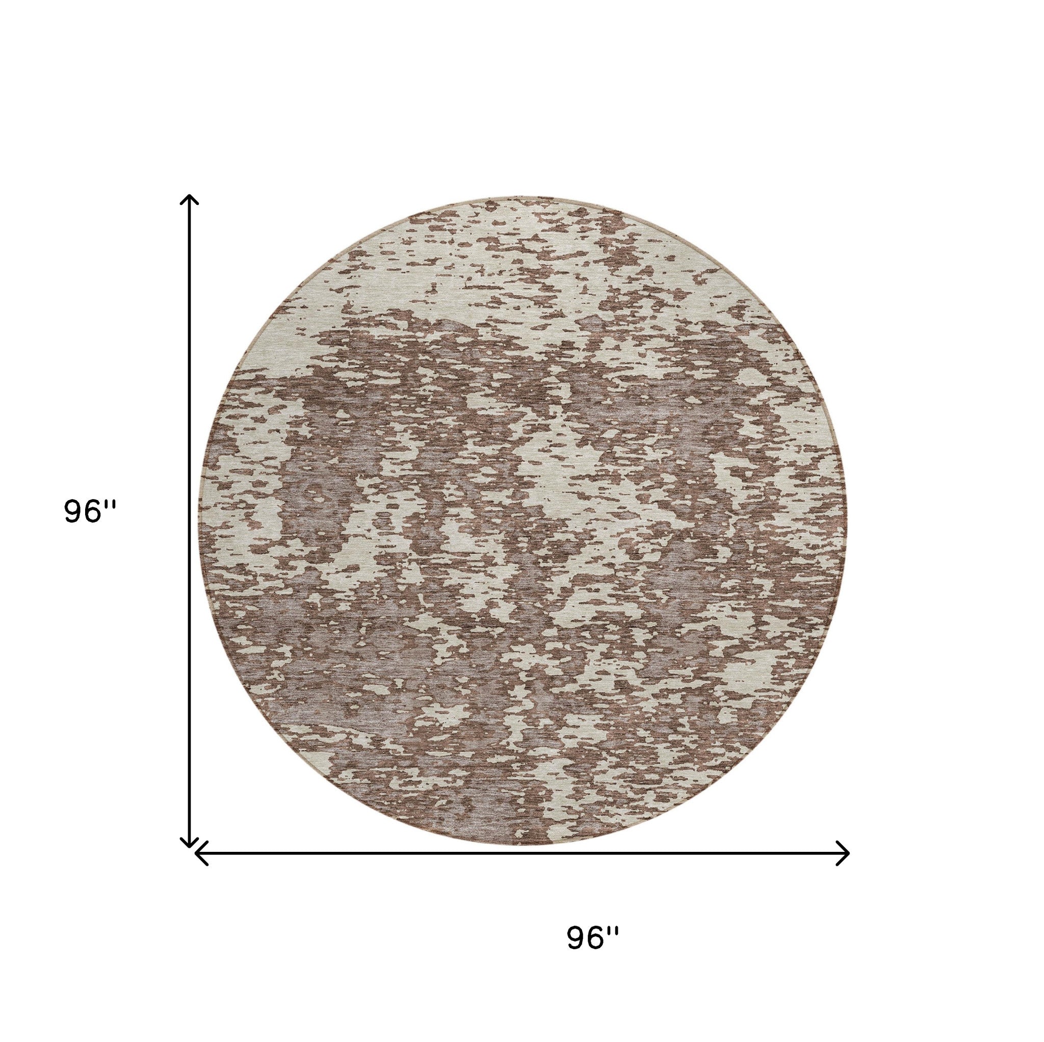 This 8-foot brown and ivory round abstract washable indoor outdoor area rug, is a great way to add warmth to a room. This geometric round shaped rug features a abstract pattern in brown and ivory that combines a good looking print with a unique and updated shape. The mix of shape, color, and design gives this rug refreshing visual interest. Ideal for outdoor spaces or high traffic areas with kids and pets, this rug is made from heavy duty polyester that is stain resistant to help repel water, dirt, and stains. Versatile in use, durable, and easy to maintain, this rug is an ideal solution to add a decorative and inviting touch to your indoor or outdoor space. 96-inch h x 96-inch w x 0.19-inch d.