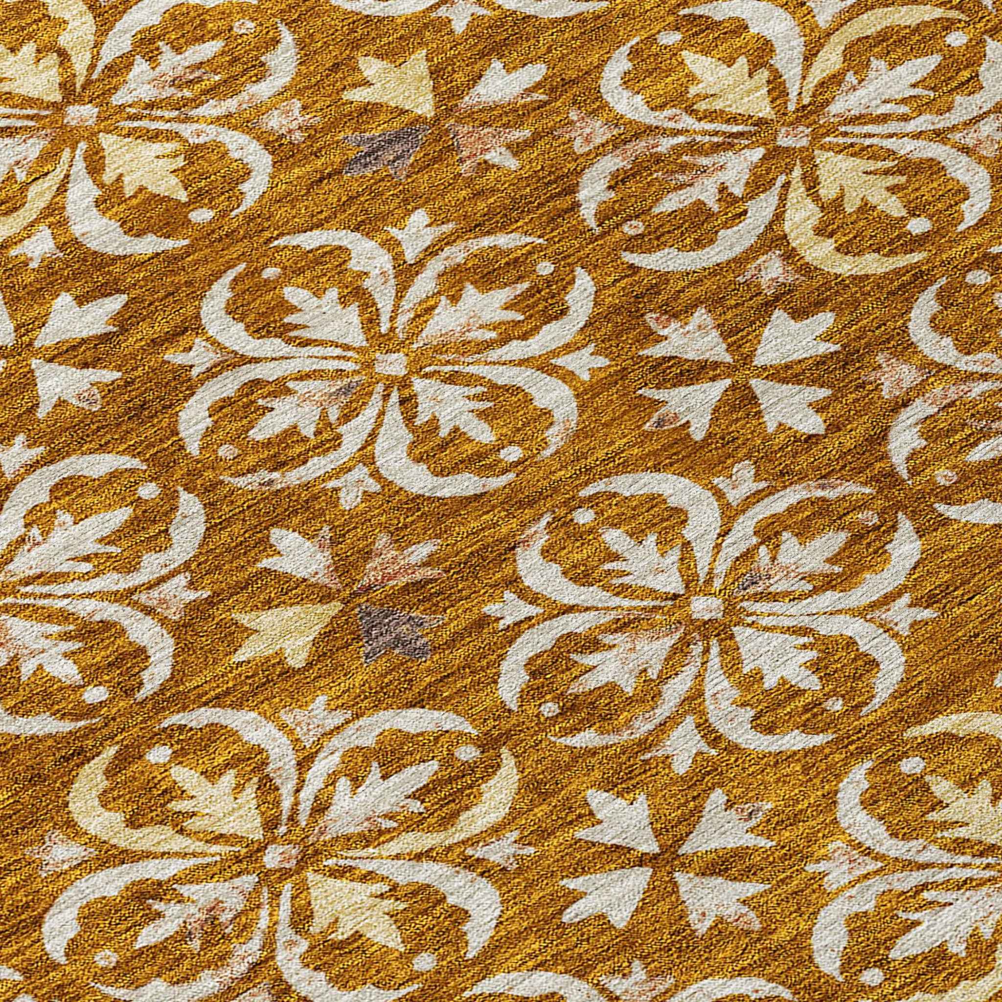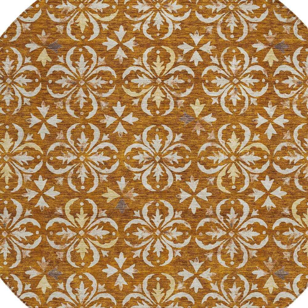 8' Copper And Beige Round Floral Washable Indoor Outdoor Area Rug