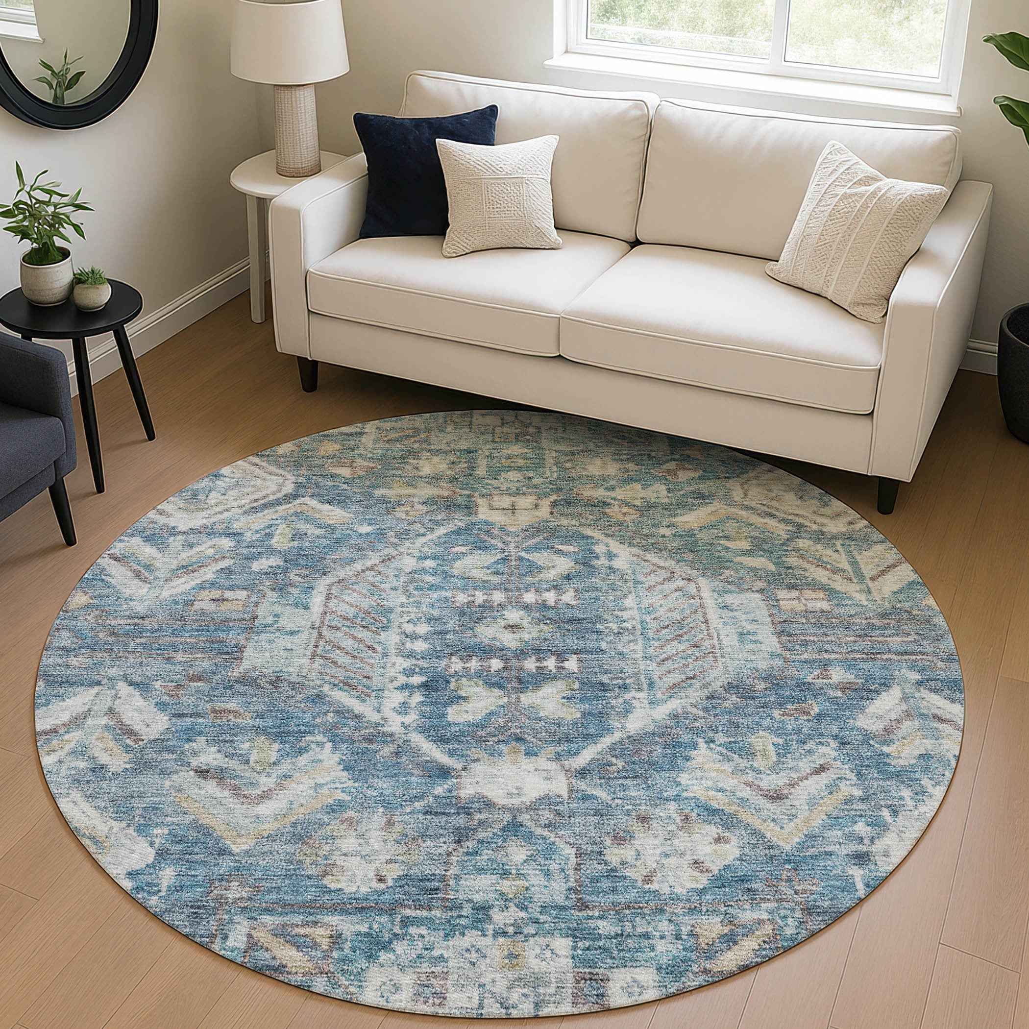8' Denim Blue And Ivory Round Medallion Washable Indoor Outdoor Area Rug