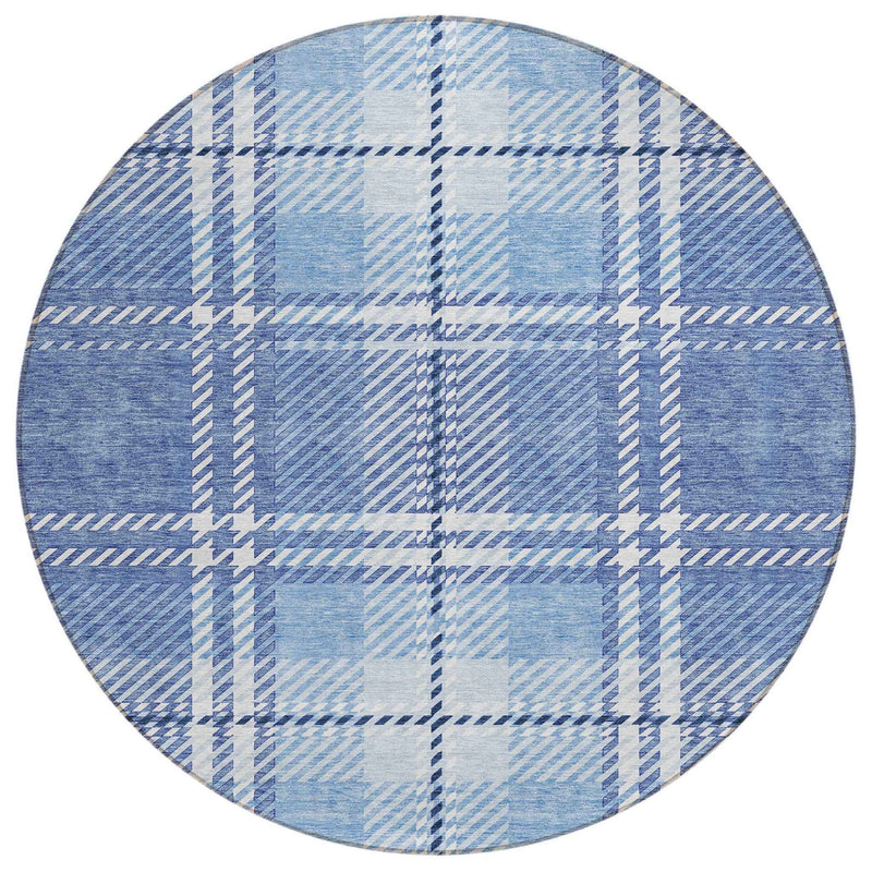 8' Denim Blue And Ivory Round Plaid Washable Indoor Outdoor Area Rug