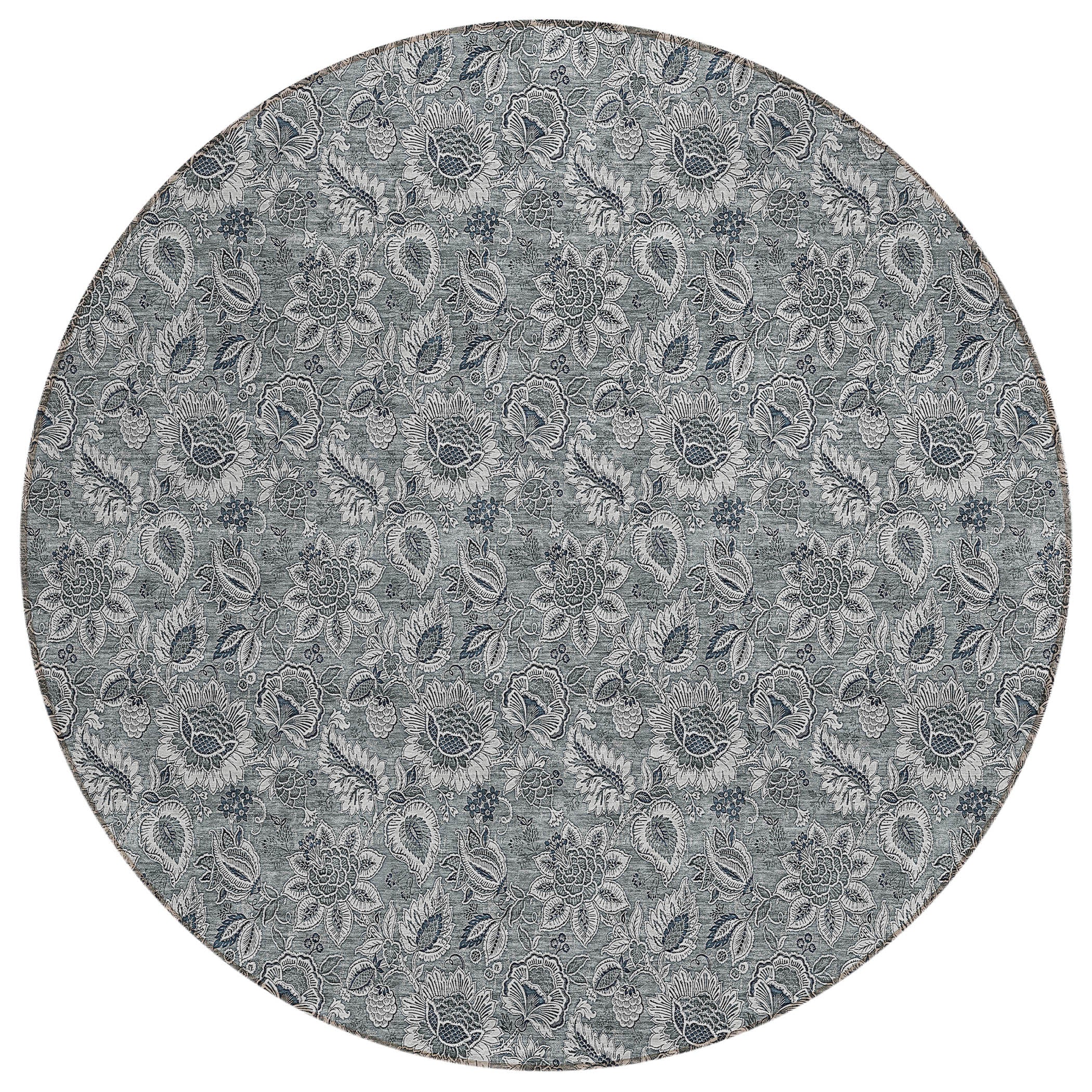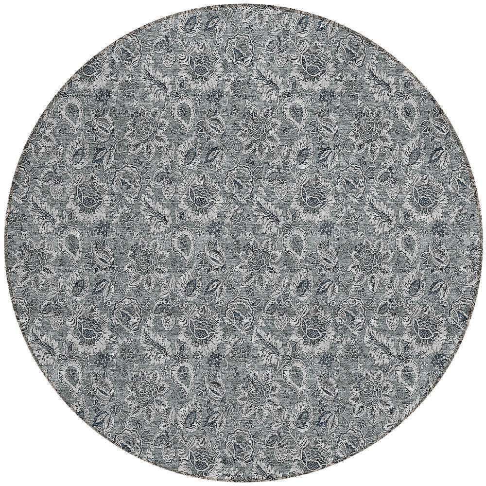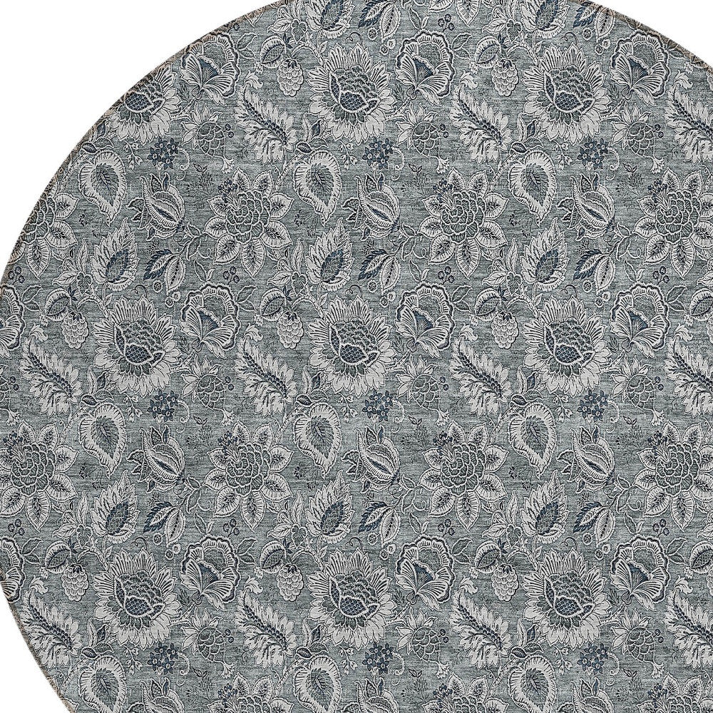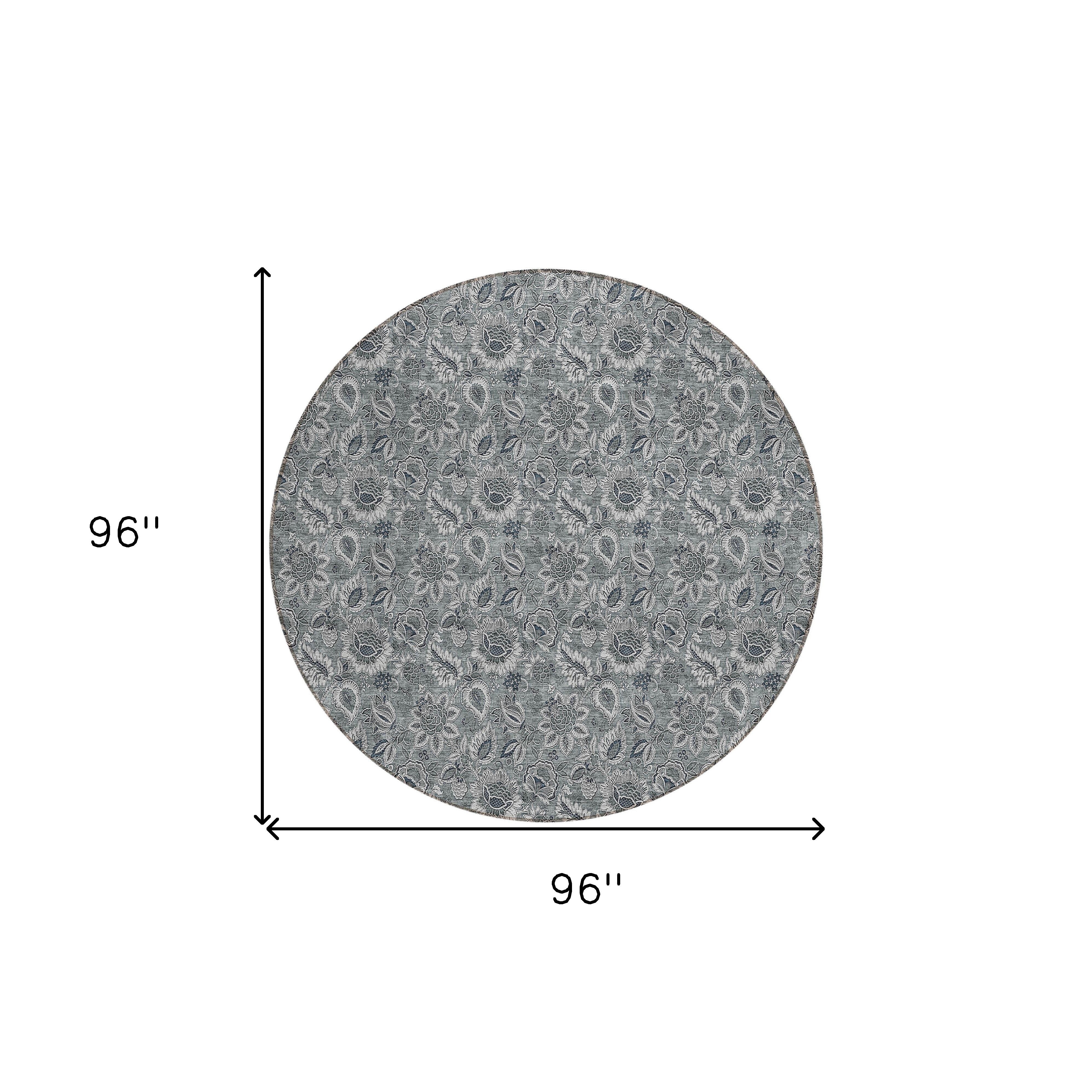 8' Gray Silver And Charcoal Round Floral Washable Indoor Outdoor Area Rug