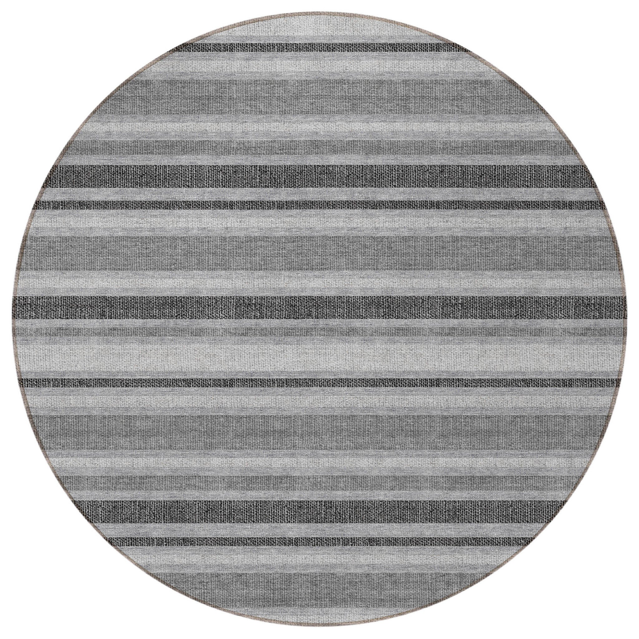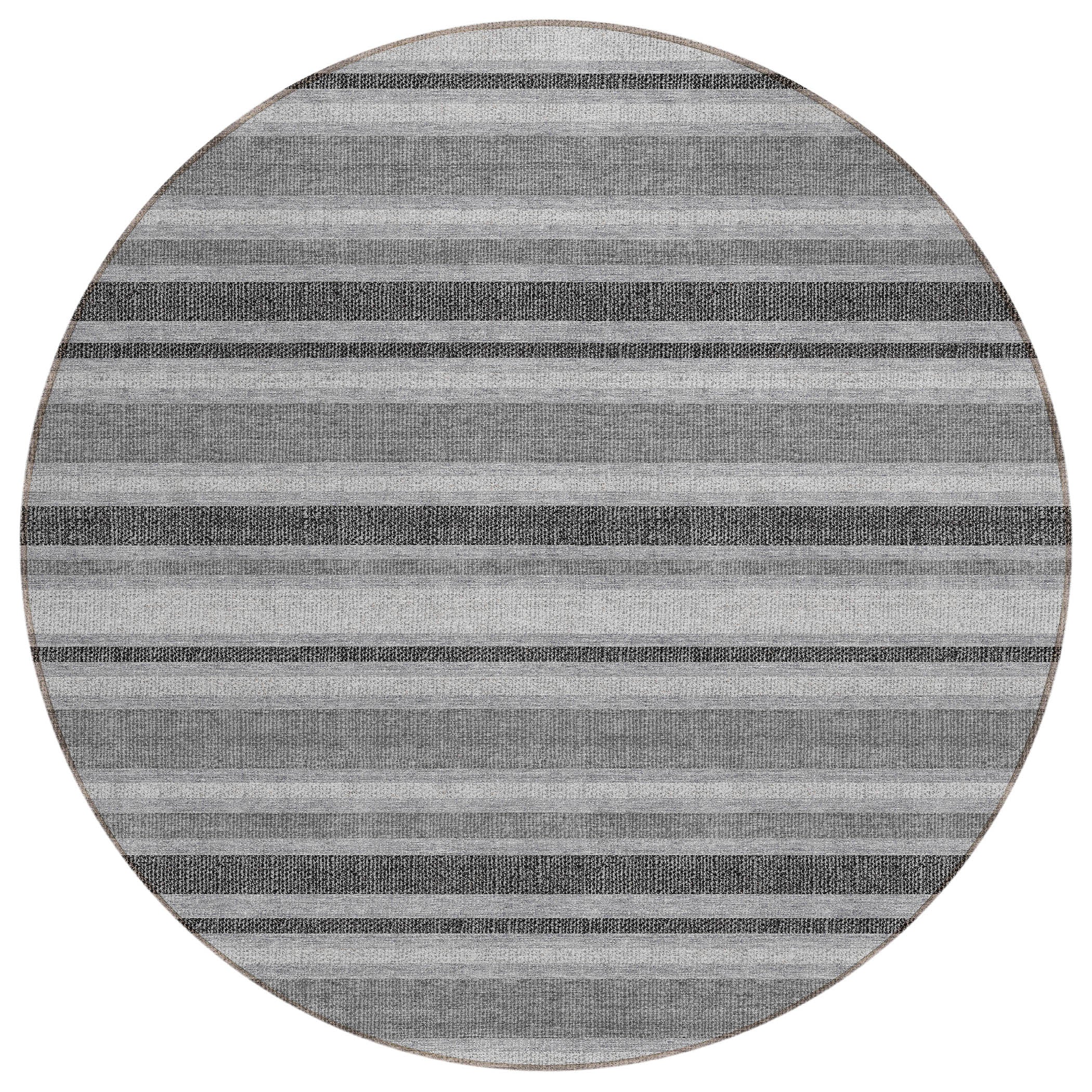 Set an inviting tone in your space with this 8-foot round gray and black round striped washable stain resistant non skid indoor outdoor area rug. This geometric round shaped rug features a striped pattern in gray and black that combines a good looking print with a unique and updated shape. The mix of shape, color, and design gives this rug refreshing visual interest. Ideal for spaces with kids and pets, this rug is stain resistant to help repel stains and spilled liquids. Area rugs help to give warmth and sense of home to your space. 96-inch H x 96-inch W x 0.19-inch D