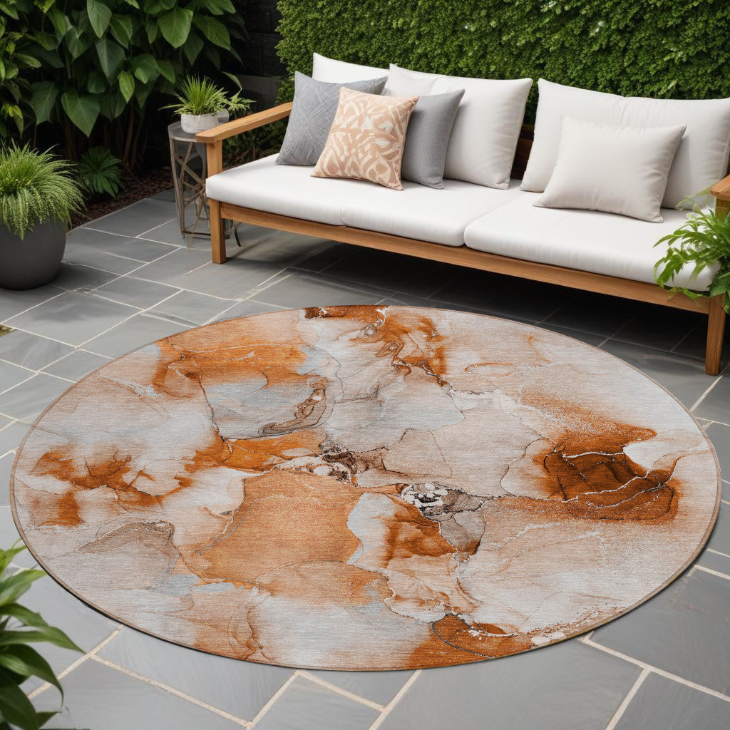8' Round Orange and Ivory Round Abstract Washable Non Skid Indoor Outdoor Area Rug